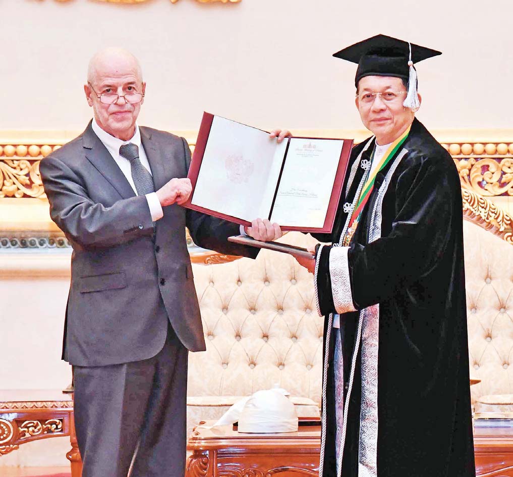 ထို့နောက် ရုရှားသိပ္ပံအကယ်ဒမီ၊ အရှေ့တိုင်းလေ့လာရေးအင်စတီကျူ့၏ President က နိုင်ငံတော်စီမံအုပ်ချုပ်ရေးကောင်စီဥက္ကဋ္ဌ နိုင်ငံတော်ဝန်ကြီးချုပ်အား “ဂုဏ်ထူးဆောင် ဒေါက်တာဘွဲ့”ကိုပေးအပ်ချီးမြှင့်ရာ နိုင်ငံတော်စီမံအုပ်ချုပ်ရေးကောင်စီဥက္ကဋ္ဌ နိုင်ငံတော်ဝန်ကြီးချုပ်က လက်ခံရယူသည်။