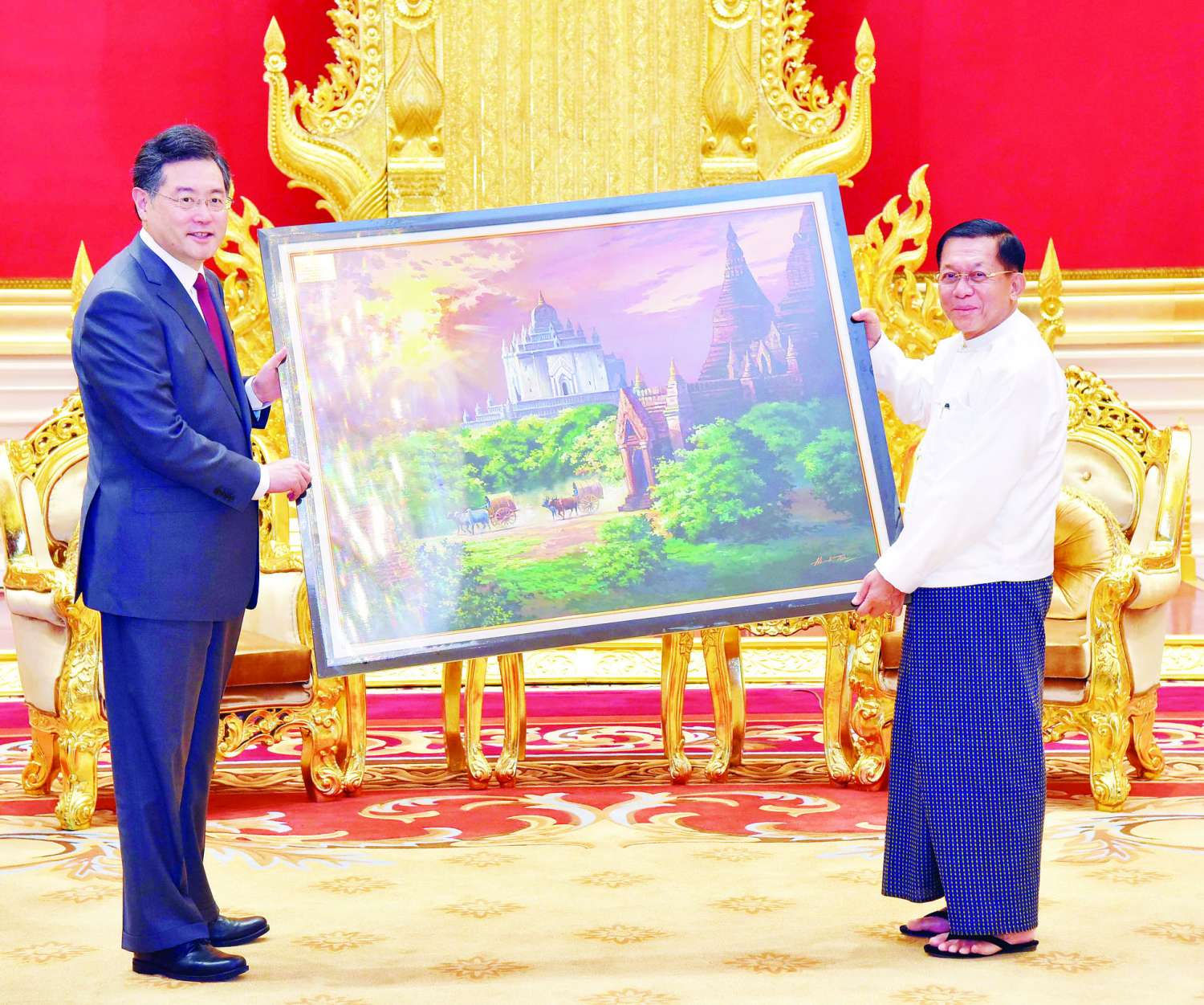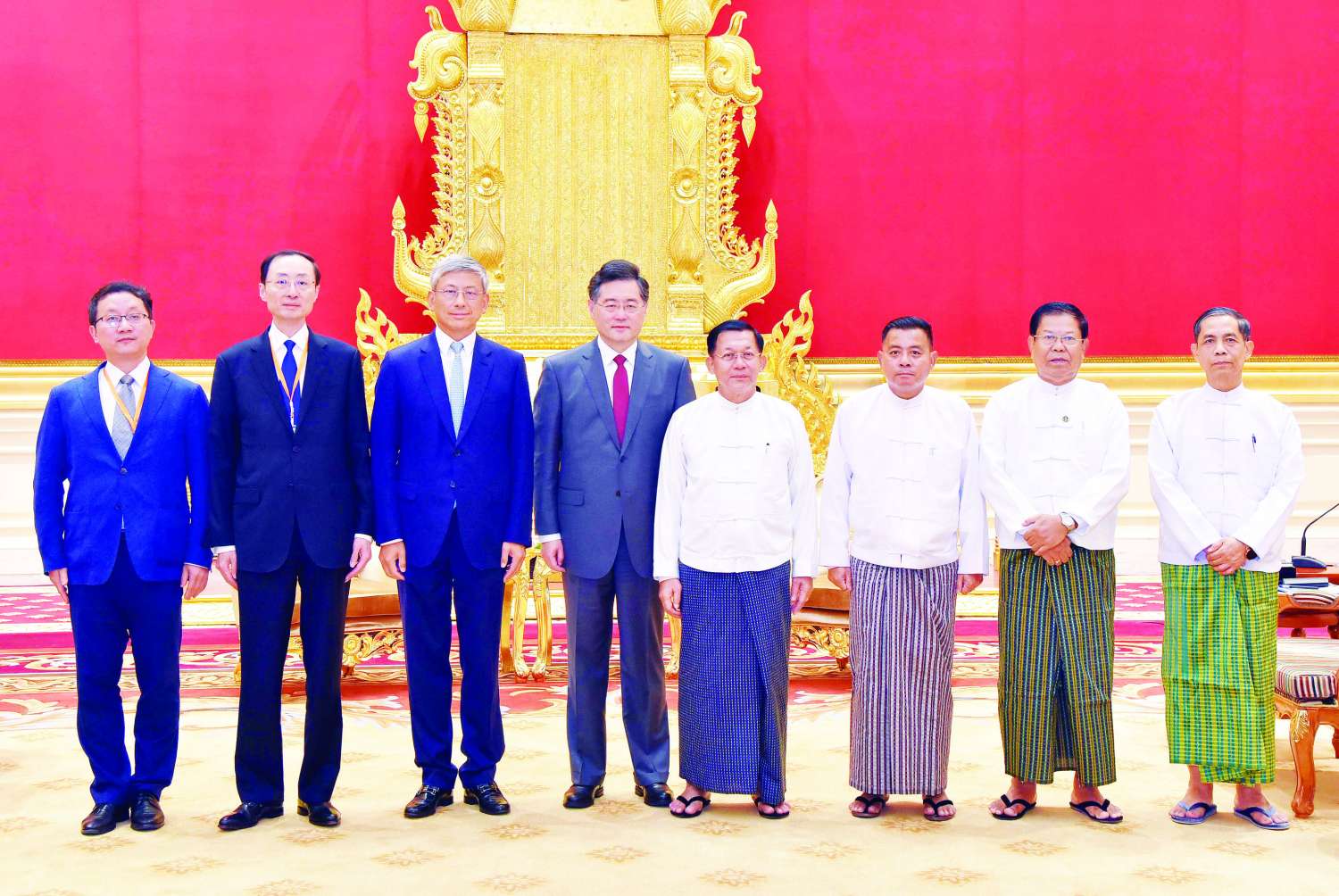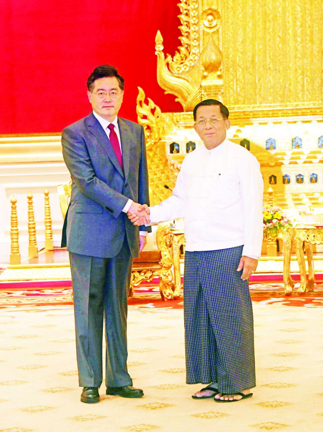 နိုင်ငံတော်စီမံအုပ်ချုပ်ရေးကောင်စီဥက္ကဋ္ဌ နိုင်ငံတော်ဝန်ကြီးချုပ် ဗိုလ်ချုပ်မှူးကြီး မင်းအောင်လှိုင် တရုတ်ပြည်သူ့သမ္မတနိုင်ငံ၊ နိုင်ငံတော်ကောင်စီဝင်နှင့် နိုင်ငံခြားရေးဝန်ကြီး H. E. Mr. Qin Gang အား လက်ခံတွေ့ဆုံ