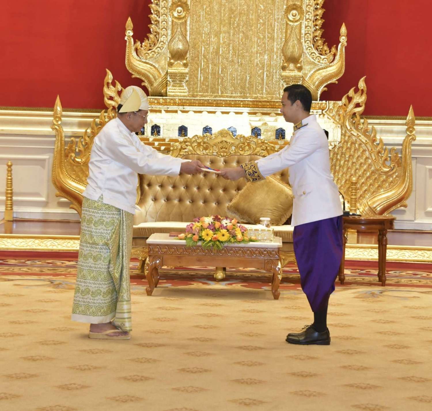 နိုင်ငံတော်စီမံအုပ်ချုပ်ရေးကောင်စီဥက္ကဋ္ဌ နိုင်ငံတော်ဝန်ကြီးချုပ် ဗိုလ်ချုပ်မှူးကြီး မင်းအောင်လှိုင် ထံ မြန်မာနိုင်ငံဆိုင်ရာ ကမ္ဘောဒီးယားနိုင်ငံသံအမတ်ကြီးအဖြစ် ခန့်အပ်ရန်သဘောတူညီပြီးဖြစ်သော သံအမတ်ကြီး H.E. Mr. CHUM Angvichet သည် ယနေ့နံနက် ၁၀ နာရီတွင် နေပြည်တော်ရှိ နိုင်ငံတော်စီမံအုပ်ချုပ်ရေးကောင်စီဥက္ကဋ္ဌရုံး၊ သံတမန်ဆောင်ဧည့်ခန်းမ၌ ၎င်း၏ သံအမတ်ခန့်အပ်လွှာကို ပေးအပ်သည်။