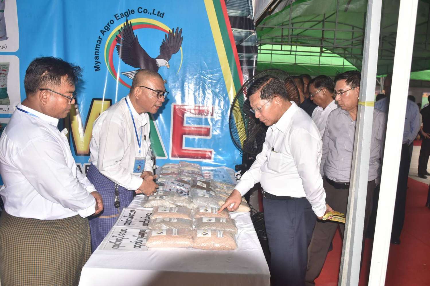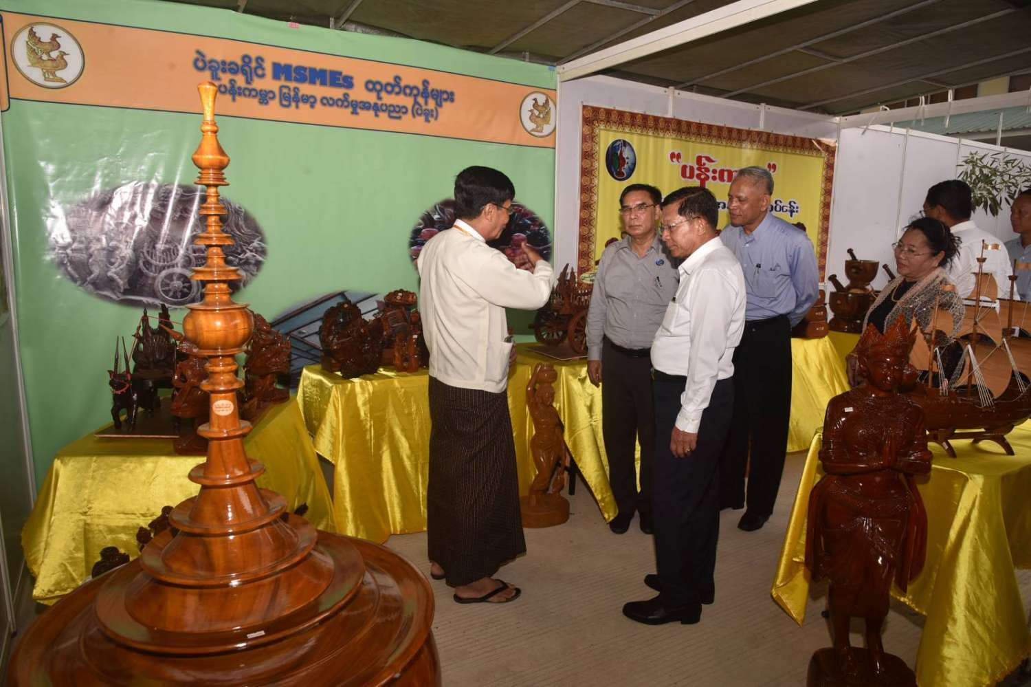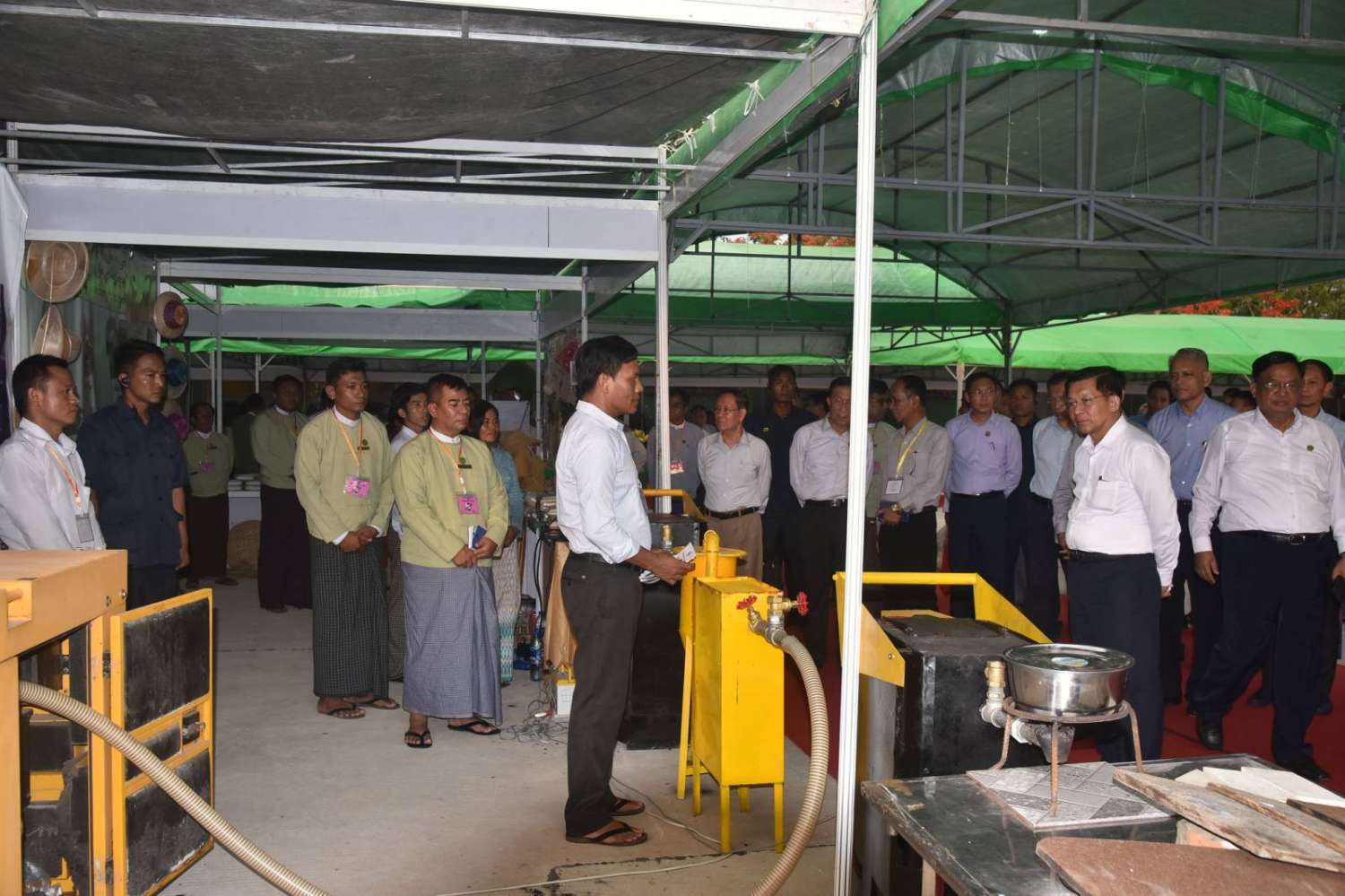 ယင်းနောက် နိုင်ငံတော်စီမံအုပ်ချုပ်ရေးကောင်စီဥက္ကဋ္ဌ နိုင်ငံတော်ဝန်ကြီးချုပ်သည် ခင်းကျင်းပြသထားသည့် ဒေသထွက်ကုန်ပစ္စည်းများ၊ စားသောက်ကုန်၊ လူသုံးကုန်၊ စက်မှုလက်မှုထုတ်ကုန်၊ ရိုးရာလက်မှုထုတ်ကုန်များ၊ အဝတ်အထည်များ စသည့်ထုတ်ကုန်ပစ္စည်းများ ခင်းကျင်းပြသထားရှိမှုများကို ပြကွက်တစ်ခုချင်းစီအလိုက် စိတ်ဝင်တစားဖြင့် လေ့လာခဲ့ပြီး ဈေးကွက်ရရှိမှုအခြေအနေများကို မေးမြန်းဆွေးနွေးရာ လုပ်ငန်းအလိုက် စီးပွားရေးလုပ်ငန်းရှင်များက လိုက်လံရှင်းလင်းတင်ပြခဲ့ကြောင်း သတင်းရရှိသည်။