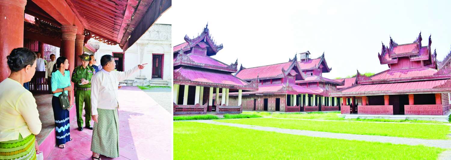 ဦးစွာ နိုင်ငံတော်စီမံအုပ်ချုပ်ရေးကောင်စီဥက္ကဋ္ဌ နိုင်ငံတော်ဝန်ကြီးချုပ်နှင့်အဖွဲ့ဝင်များသည် မှန်နန်းတော်ကြီး၊ ဗောင်းတော်ဆောင်၊ ညီလာခံကျင်းပရာအဆောင်များ၊ မှန်နန်းဆောင်၊ အလယ်နန်းဆောင်တို့အပါအဝင် ရွှေနန်းတော်ကြီးအတွင်းလှည့်လည် ကြည့်ရှုကြရာ မြနန်းစံကျော်ရွှေနန်းတော်ကြီး အဝန်းအဝိုင်းတစ်ခုလုံးကို ထိန်းသိမ်းထားရှိမှုများနှင့် ပတ်သက်၍ သာသနာရေးနှင့် ယဉ်ကျေးမှုဝန်ကြီးဌာန ပြည်ထောင်စုဝန်ကြီးဦးကိုကို၊ သာသနာရေးဝန်ကြီးဌာန၊ ရှေးဟောင်းသုတေသနနှင့်အမျိုးသားပြတိုက်ဦးစီးဌာန၊ မန္တလေးဌာနခွဲ လက်ထောက်ညွှန်ကြားရေးမှူး ဒေါ်မျိုးမျိုးသောင်းနှင့်တာဝန်ရှိသူများက ရှင်းလင်းတင်ပြကြသည်။