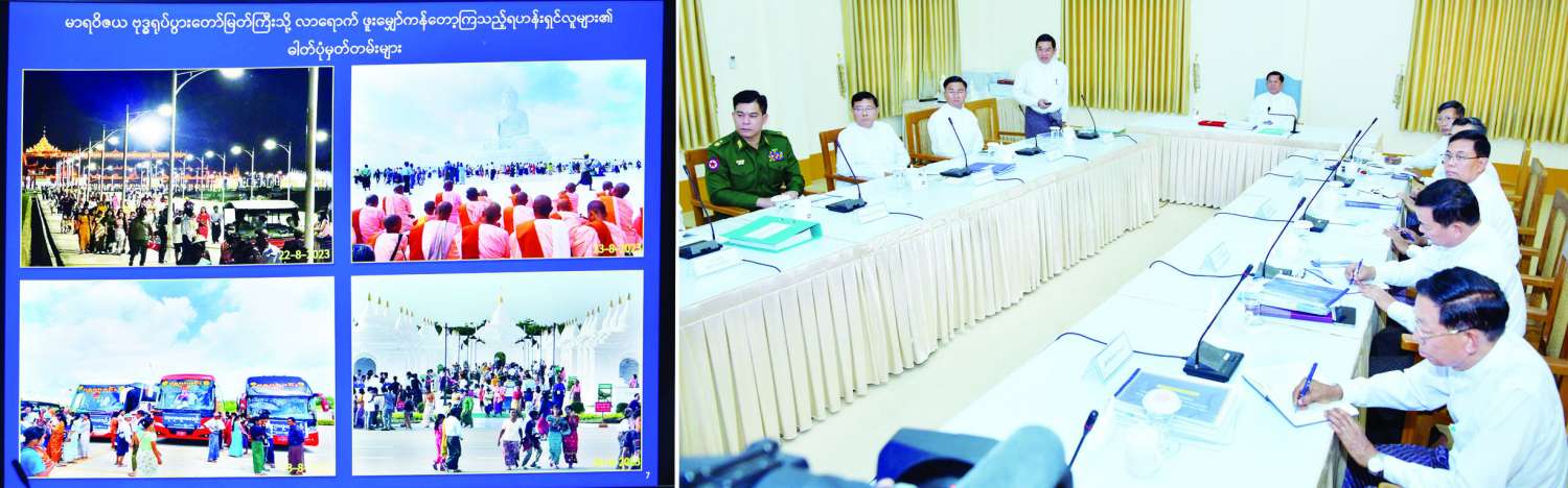 ဦးစွာ နိုင်ငံတော်စီမံအုပ်ချုပ်ရေးကောင်စီဥက္ကဋ္ဌ၏ အကြံပေးပုဂ္ဂိုလ် ဒုတိယဗိုလ်ချုပ်ကြီးညိုစောက နိုင်ငံတော်စီမံအုပ်ချုပ်ရေးကောင်စီဥက္ကဋ္ဌ နိုင်ငံတော်ဝန်ကြီးချုပ်၏ လမ်းညွှန်ချက်များနှင့်အညီ ဘုရားဖူးလာပြည်သူများ အေးငြိမ်းချမ်းသာစွာဖြင့် ဘုရားဖူးနိုင်ရေး စီမံဆောင်ရွက်ထားရှိမှု၊ အနယ်နယ်အရပ်ရပ်မှ ရဟန်းရှင်လူပြည်သူများ၊ ဝန်ထမ်းများ၊ ကျောင်းသား၊ ကျောင်းသူများနှင့် ပြည်ပမှနိုင်ငံခြားသားဧည့်သည်များ နေ့အလိုက် လာရောက်ဖူးမြော်ကြည်ညိုလျက်ရှိရာ စတင်ဖွင့်လှစ်သည့်နေ့မှ ယခုလ ၃၀ ရက်အထိ ဘုရားဖူးလာသံဃာတော် ၈၂၄၁ ပါး၊ သီလရှင် ၁၉၉၈ ပါး၊ လူပုဂ္ဂိုလ် ၃၂၇၈၇၁ ဦး စုစုပေါင်း ၃၃၈၁၁၀ လာရောက်ဖူးမြော်ကြည်ညိုခဲ့မှု၊ ရဟန်း၊ သံဃာ၊ သီလရှင်များ၊ ကျောင်းအစီအစဉ်ဖြင့်လာရောက်သည့် ကျောင်းသား၊ ကျောင်းသူများကို အခမဲ့ဖူးမြော်ခွင့်နှင့် ဝန်ထမ်းများအား ဝန်ထမ်းကတ်ဖြင့် ၅၀ ရာခိုင်နှုန်း လျှော့ချကောက်ခံရန် လျာထားဆောင်ရွက်ထားရှိမှု၊ Ticket House တည်ဆောက်ပြီးစီးမှုနှင့် စမ်းသပ်ဆောင်ရွက်လျက်ရှိမှု၊ ပြည်တွင်း၊ ပြည်ပဘုရားဖူးများက စေတနာသဒ္ဓါတရားထက်သန်စွာဖြင့် အလှူငွေများ လှူဒါန်းလျက်ရှိမှု၊ မာရဝိဇယ ဗုဒ္ဓရုပ်ပွားတော်မြတ်ကြီးသို့ ပရဟိတအသင်းများက အထောက်အကူပြုပစ္စည်းများ လာရောက်လှူဒါန်းလျက်ရှိမှု၊ ဘုရားဖူးလာပြည်သူများ သောက်သုံးရေအဆင်ပြေစေရေး နေပြည်တော်သောက်ရေသန့်များ စီစဉ်ဆောင်ရွက်ပေးထားမှု၊ ဘုရားကြီးပတ်ဝန်းကျင်သန့်ရှင်းသာယာ လှပမှုရှိစေရေး ဆောင်ရွက်ထားရှိမှု၊ လျှပ်စစ်မီးသုံးစွဲမှု သက်သာစေရေး နေရောင်ခြည်စွမ်းအင်သုံးလျှပ်စစ်မီးများ တပ်ဆင်ဆောင်ရွက်ထားရှိမှု၊ ဘုရားဖူးမော်တော်ယာဉ်များနှင့် မော်တော်ဆိုင်ကယ်များ ရပ်နားရန်နေရာများ စီစဉ်ဆောင်ရွက်လျက်ရှိမှု၊ မာရဝိဇယဗုဒ္ဓရုပ်ပွားတော်မြတ်ကြီး နာယကအဖွဲ့၊ ထိန်းသိမ်းစောင့်ရှောက်ရေးဦးစီးကော်မတီ၊ ဂေါပကအဖွဲ့၊ အထောက်အကူပြုအဖွဲ့များဖွဲ့စည်းရန် လျာထားမှုနှင့် ဘုရားကြီးဝေယျာဝစ္စနှင့် ဆက်စပ်လုပ်ငန်းများဆောင်ရွက်နိုင်ရန် စီမံဆောင်ရွက်လျက်ရှိမှု၊ မာရဝိဇယ ဗုဒ္ဓရုပ်ပွားတော်မြတ်ကြီး ရေရှည်တည်တံ့ခိုင်မြဲရန် ဆောင်ရွက်သွားမည့်အခြေအနေများကို ရှင်းလင်းတင်ပြသည်။