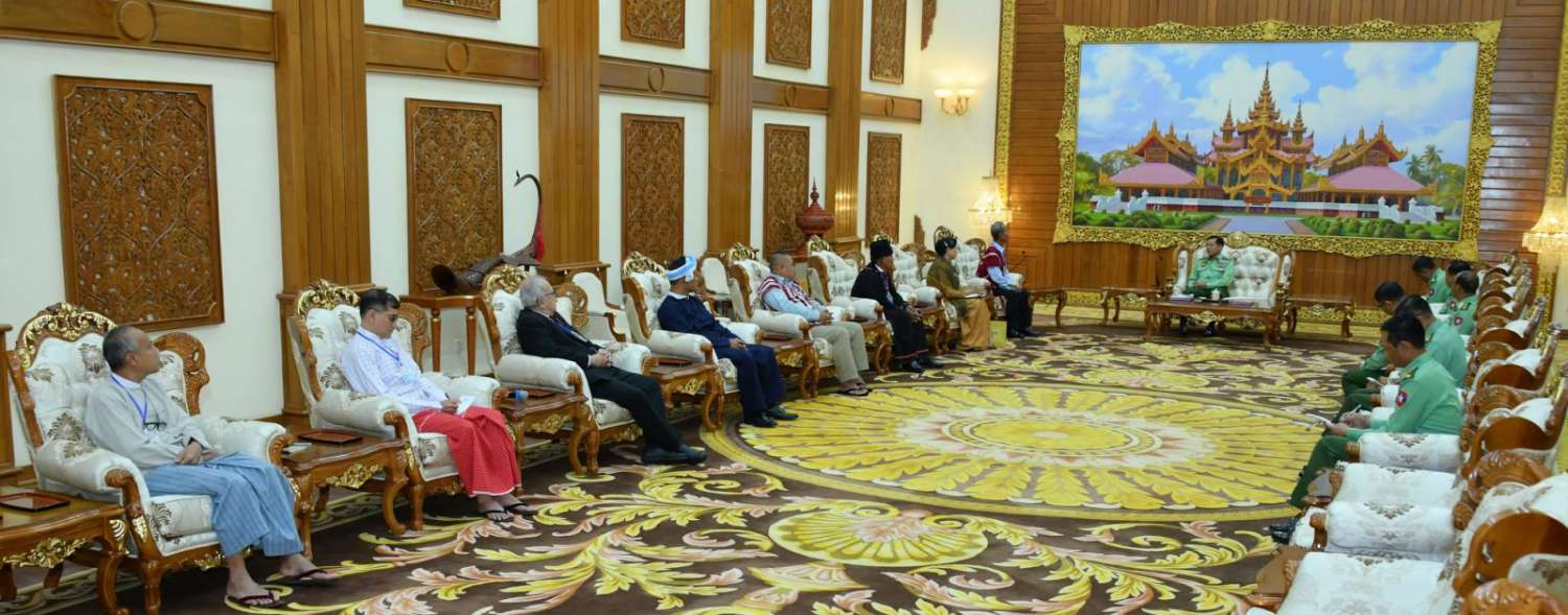 နိုင်ငံတော်စီမံအုပ်ချုပ်ရေးကောင်စီဥက္ကဋ္ဌ တပ်မတော်ကာကွယ်ရေးဦးစီးချုပ် ဗိုလ်ချုပ်မှူးကြီးမင်းအောင်လှိုင်အား တစ်နိုင်ငံလုံး ပစ်ခတ်တိုက်ခိုက်မှုရပ်စဲရေး သဘောတူစာချုပ်(NCA) (၈)နှစ်မြောက် နှစ်ပတ်လည်နေ့အခမ်းအနားသို့ တက်ရောက်ခဲ့သော တိုင်းရင်းသားလက်နက်ကိုင်ကိုယ်စားလှယ်အဖွဲ့များက ယနေ့နံနက်ပိုင်းတွင် နေပြည်တော်ရှိ ဘုရင့်နောင်ရိပ်သာ၊ ဧည့်ခန်းမဆောင်၌ လာရောက်ဂါရဝပြုတွေ့ဆုံသည်။