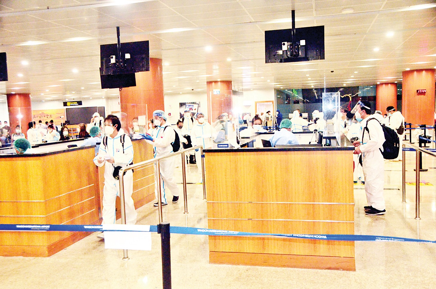 ၎င်းတို့ ရန်ကုန်အပြည်ပြည်ဆိုင်ရာလေဆိပ်သို့ ရောက်ရှိချိန်တွင် လူဝင်မှုကြီးကြပ်ရေး၊ ကျန်းမာရေး စစ်ဆေး ရေးနှင့် ၂၁ ရက်တာ အသွားအလာကန့်သတ် နေထိုင်ရေးတို့ကို အလုပ်သမား၊ လူဝင်မှုကြီးကြပ်ရေးနှင့် ပြည်သူ့ အင်အားဝန်ကြီးဌာန၊ ကျန်းမာရေးနှင့် အားကစား ဝန်ကြီးဌာနနှင့် ရန်ကုန်တိုင်းဒေသကြီး အစိုးရအဖွဲ့တို့က သက်ဆိုင်ရာ အခန်းကဏ္ဍ အလိုက် တာဝန်ယူဆောင်ရွက်ပေးခဲ့သည်။