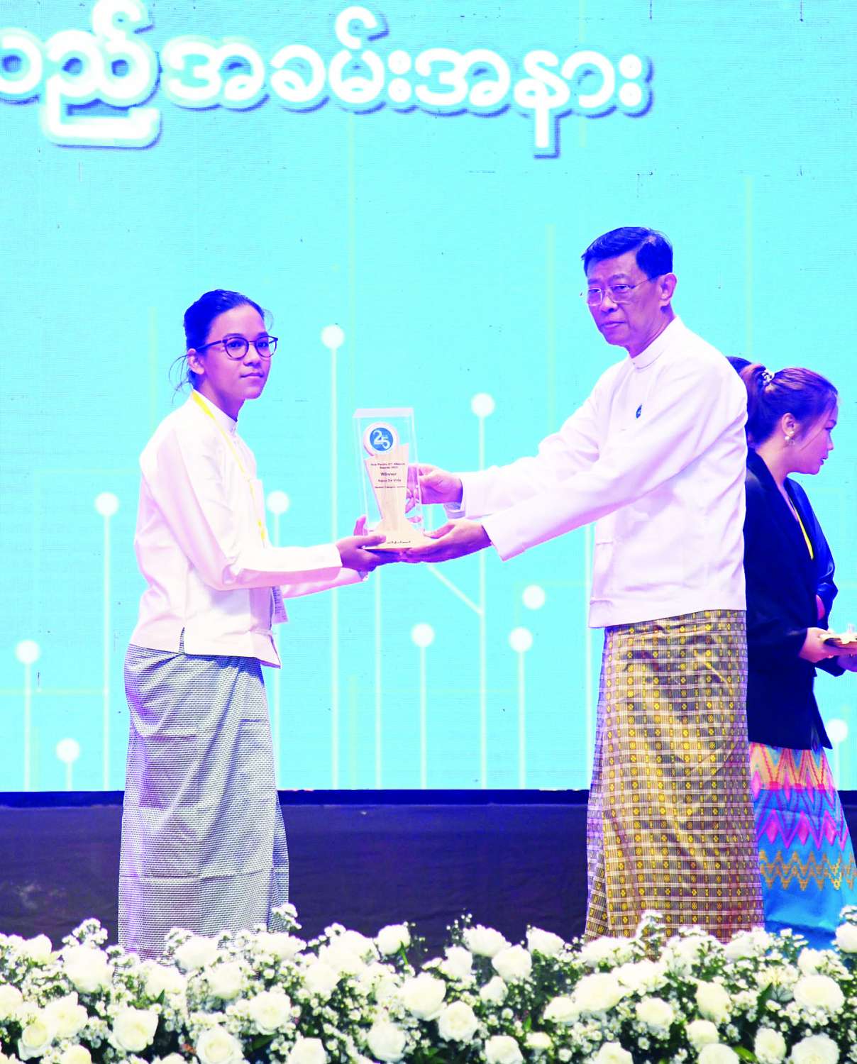 ယင်းနောက် မြန်မာနိုင်ငံကွန်ပျူတာပညာဖွံ့ဖြိုးရေးကောင်စီဥက္ကဋ္ဌ ဒုတိယဝန်ကြီးချုပ်နှင့် ပို့ဆောင်ရေးနှင့်ဆက်သွယ်ရေးဝန်ကြီးဌာန ပြည်ထောင်စုဝန်ကြီးက ပြည်တွင်းပြည်ပ ICT ပြိုင်ပွဲများတွင် ဆုရရှိခဲ့ကြသူများကို ဆုများပေးအပ်ချီးမြှင့်သည်။