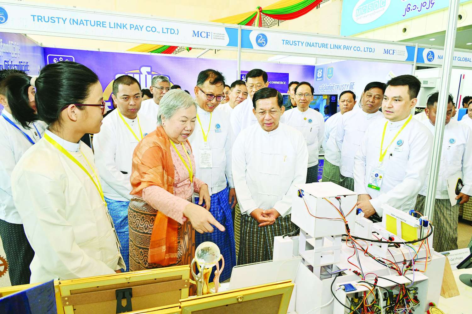 ထို့နောက် နိုင်ငံတော်စီမံအုပ်ချုပ်ရေးကောင်စီဥက္ကဋ္ဌ နိုင်ငံတော်ဝန်ကြီးချုပ်နှင့် အခမ်းအနားတက်ရောက်လာကြသူများသည် ခင်းကျင်းပြသထားသည့် ကွန်ပျူတာနည်းပညာပြခန်းများကို ပြခန်းတစ်ခုချင်းစီအလိုက် စိတ်ပါဝင်စားစွာ လှည့်လည်ကြည့်ရှုကြရာ တာဝန်ရှိသူများက ပြခန်းအလိုက် ရှင်းလင်းတင်ပြကြသည်။