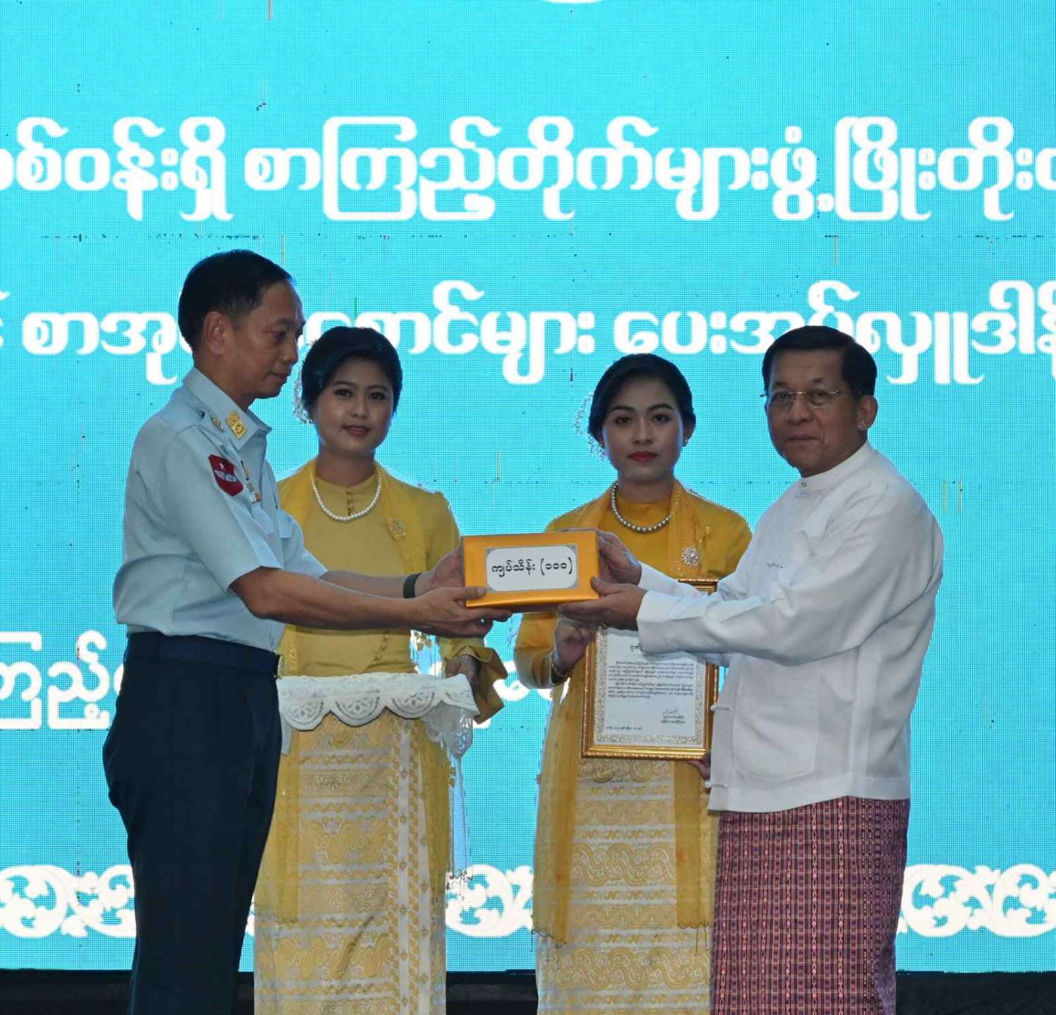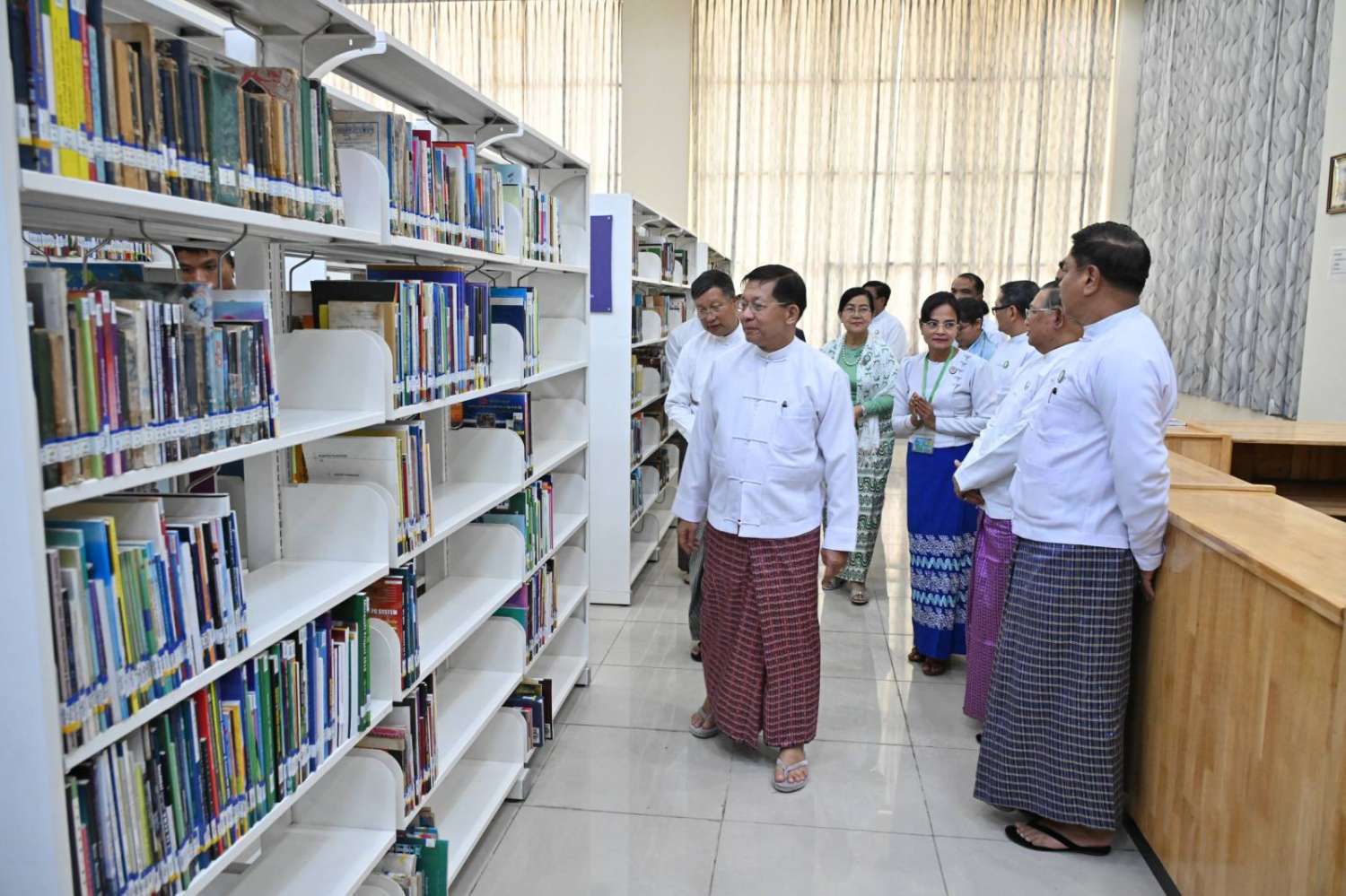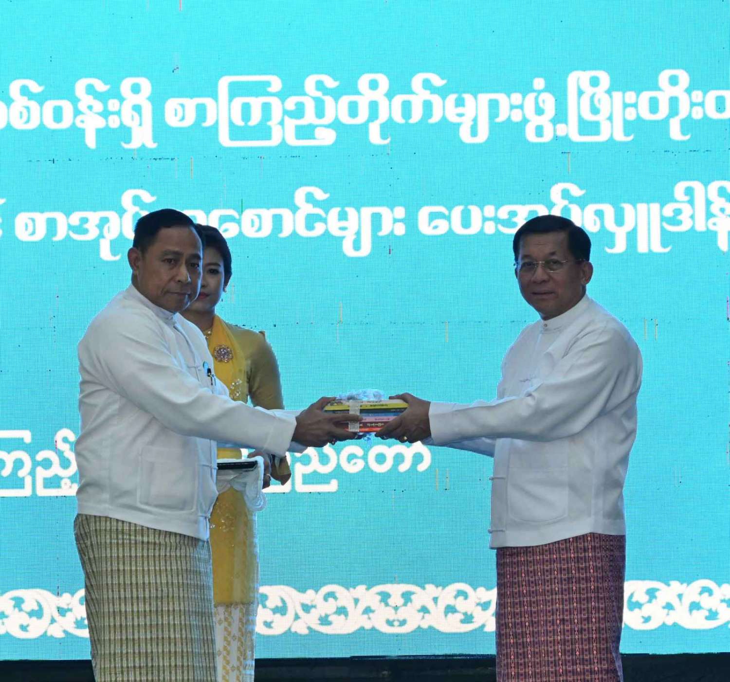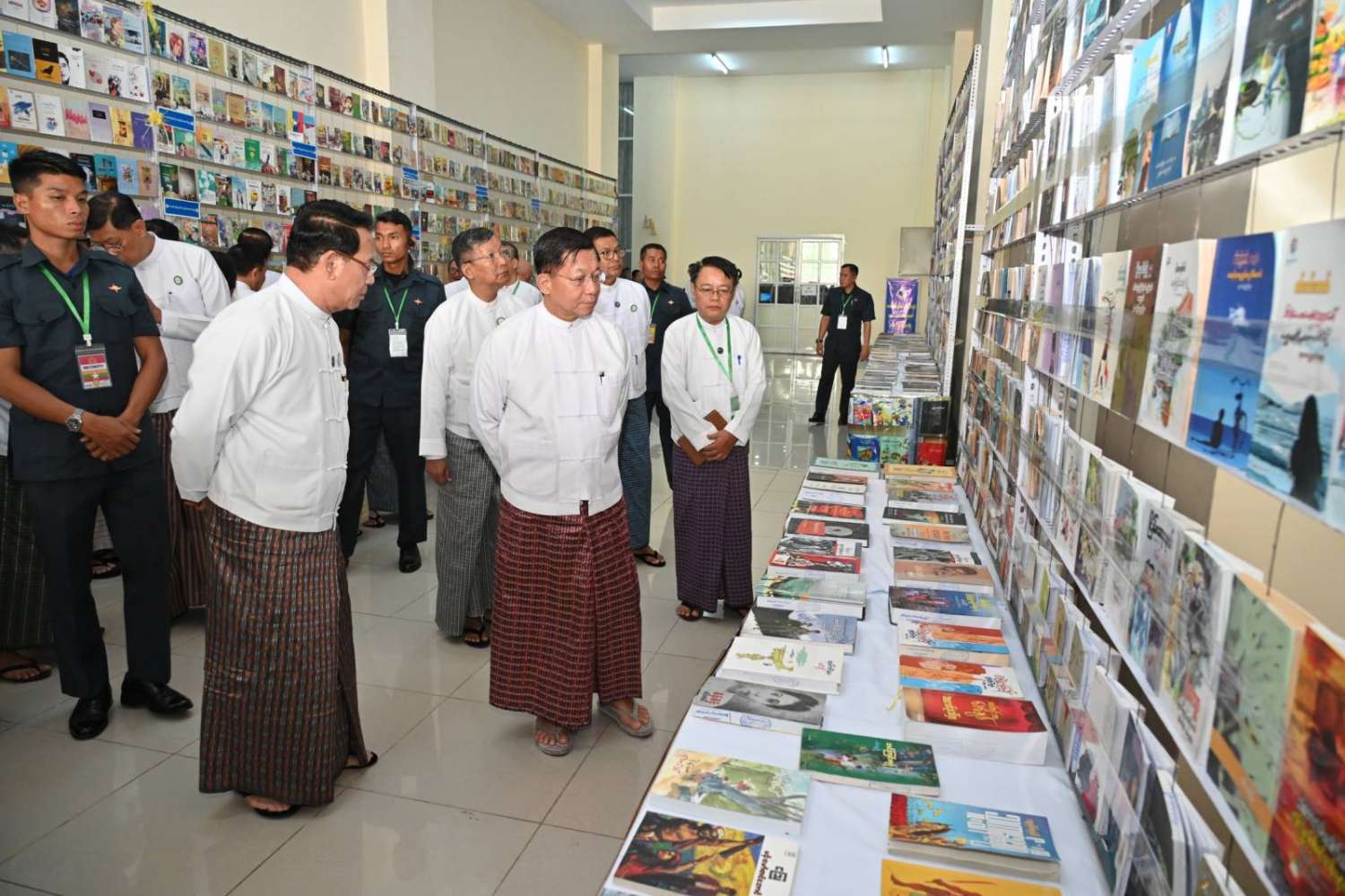 မြန်မာနိုင်ငံတစ်ဝန်းလုံးရှိ စာကြည့်တိုက်များ ဖွံ့ဖြိုးတိုးတက်ရေးအတွက် အလှူငွေနှင့် စာအုပ်စာစောင်များ ပေးအပ်လှူဒါန်းပွဲအခမ်းအနားကို ယနေ့နံနက်ပိုင်းတွင် နေပြည်တော်ရှိ အမျိုးသားစာကြည့်တိုက်၌ ကျင်းပပြုလုပ်ရာ နိုင်ငံတော်စီမံအုပ်ချုပ်ရေးကောင်စီဥက္ကဋ္ဌ နိုင်ငံတော်ဝန်ကြီးချုပ် ဗိုလ်ချုပ်မှူးကြီး မင်းအောင်လှိုင် တက်ရောက်သည်။