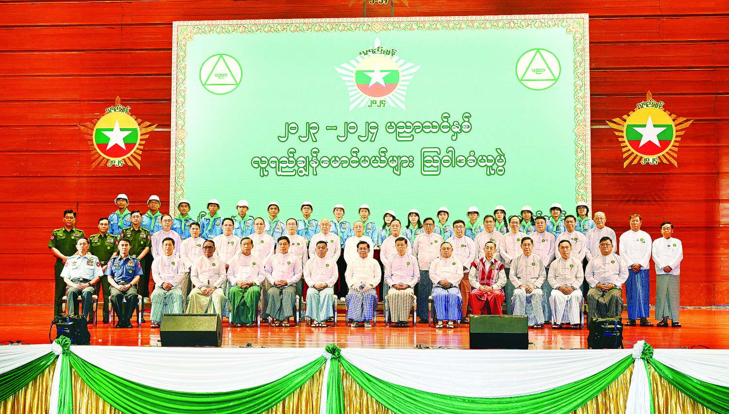 ဆက်လက်၍ နိုင်ငံတော်စီမံအုပ်ချုပ်ရေးကောင်စီဥက္ကဋ္ဌ နိုင်ငံတော်ဝန်ကြီးချုပ်နှင့် အခမ်းအနားတက်ရောက်လာကြသူများ၊ လူရည်ချွန်မောင်မယ်များသည် စုပေါင်းမှတ်တမ်းတင် ဓာတ်ပုံရိုက်ကြသည်။