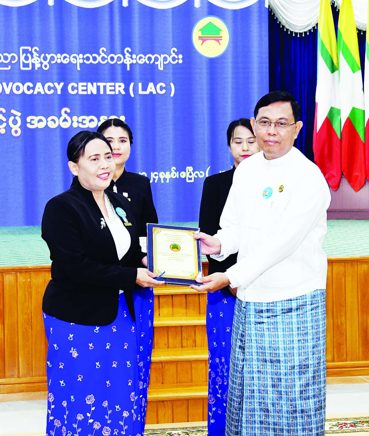 ဥပဒေရေးရာဝန်ကြီးဌာနသည် ပြည်ထောင်စုအစိုးရအတွက် အဓိကကျသည့်အခန်းကဏ္ဍမှ ပါဝင်လျက်ရှိပြီး နိုင်ငံတော်၏ရှေ့ဆက်ရမည့် လုပ်ငန်းများတွင် ဥပဒေပြုရေး၊ အုပ်ချုပ်ရေး၊ တရားစီရင်ရေးဆိုသည့် ကဏ္ဍအသီးသီးမှ ပါဝင်ဆောင်ရွက်ပေးလျက်ရှိသည့် ဝန်ကြီးဌာနဖြစ်ကြောင်း၊ ဥပဒေရေးရာဝန်ကြီးဌာနသည် နိုင်ငံတော်၏ တရားဥပဒေစိုးမိုးရေးအတွက် ပြည်သူများအကြား ဥပဒေအသိပညာပြန့်ပွားရေးကိုရည်ရွယ်ပြီး ဥပဒေဝန်ဆောင်မှုလုပ်ငန်းများကို ပုံသဏ္ဌာန်မျိုးစုံဖြင့် အကောင်အထည်ဖော်ပေးရခြင်းလည်းဖြစ်ကြောင်း၊ ထို့ကြောင့် ယခုဖွင့်လှစ်သည့် ဥပဒေအသိပညာ ပြန့်ပွားရေးသင်တန်းကျောင်း (Legal Advocacy Center)သည် ဥပဒေအသိပညာများကို ကျယ်ကျယ်ပြန့်ပြန့် ဖြန့်ဖြူးပေးနိုင်မည့်နေရာတစ်ခုအဖြစ် ပေါ်ပေါက်လာမည်ဖြစ်သဖြင့် များစွာဂုဏ်ယူဝမ်းမြောက်မိပါကြောင်းနှင့် နိုင်ငံတော်အတွက် အကျိုးရှိမည့်နေရာတစ်ခုဖြစ်သည်ဟုလည်း ဆိုရမည်ဖြစ်ကြောင်း။