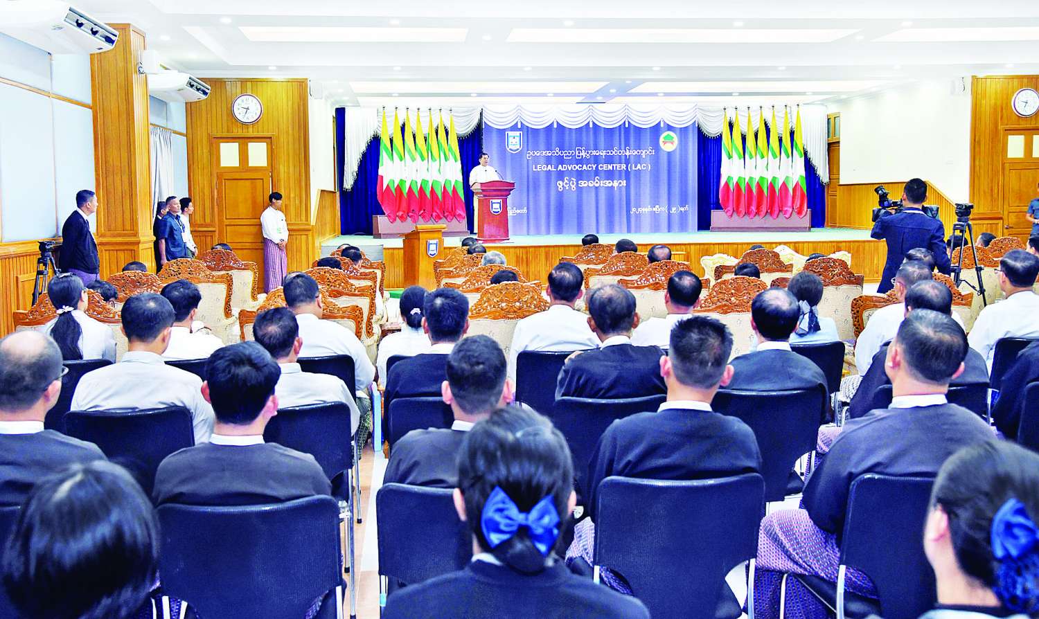 ဥပဒေရေးရာဝန်ကြီးဌာန၊ ဥပဒေအသိပညာပြန့်ပွားရေး သင်တန်းကျောင်း LEGAL ADVOCACY CENTER (LAC) ဖွင့်ပွဲအခမ်းအနားကို ယနေ့နံနက်ပိုင်းတွင် နေပြည်တော်ကောင်စီနယ်မြေ၊ ဥတ္တရသီရိမြို့နယ်၊ ဇဝနသိဒ္ဓိရပ်ကွက်ရှိ အဆိုပါသင်တန်းကျောင်း၌ ကျင်းပပြုလုပ်ရာ နိုင်ငံတော်စီမံအုပ်ချုပ်ရေးကောင်စီဥက္ကဋ္ဌ နိုင်ငံတော်ဝန်ကြီးချုပ် ဗိုလ်ချုပ်မှူးကြီးမင်းအောင်လှိုင် တက်ရောက်ဖွင့်လှစ်ပေးပြီး အမှာစကား ပြောကြားသည်။