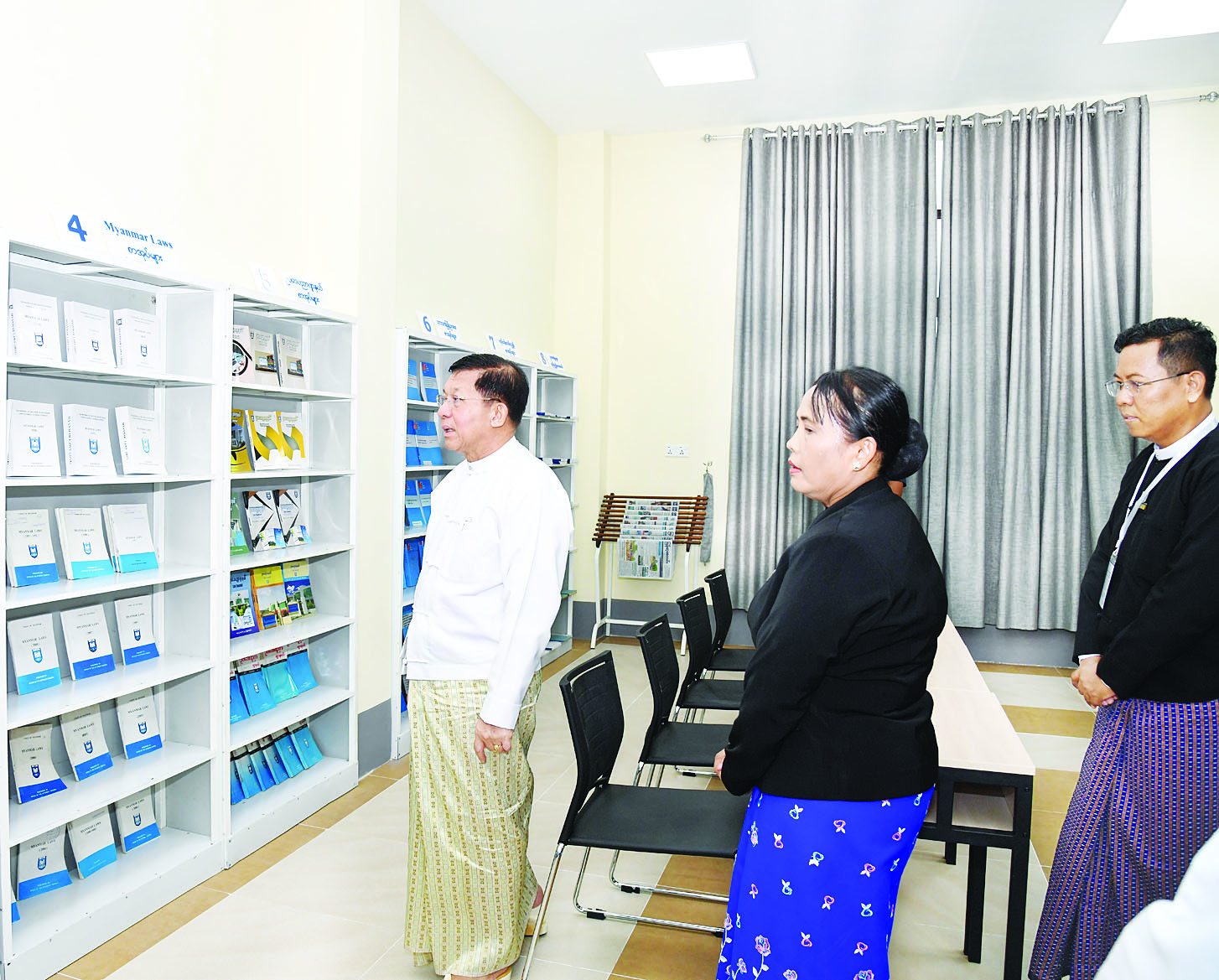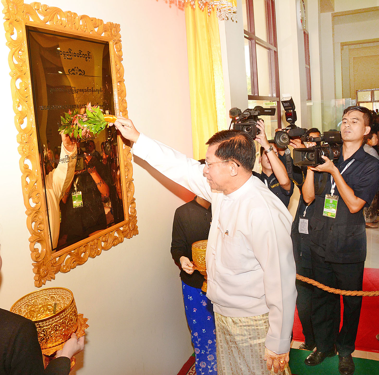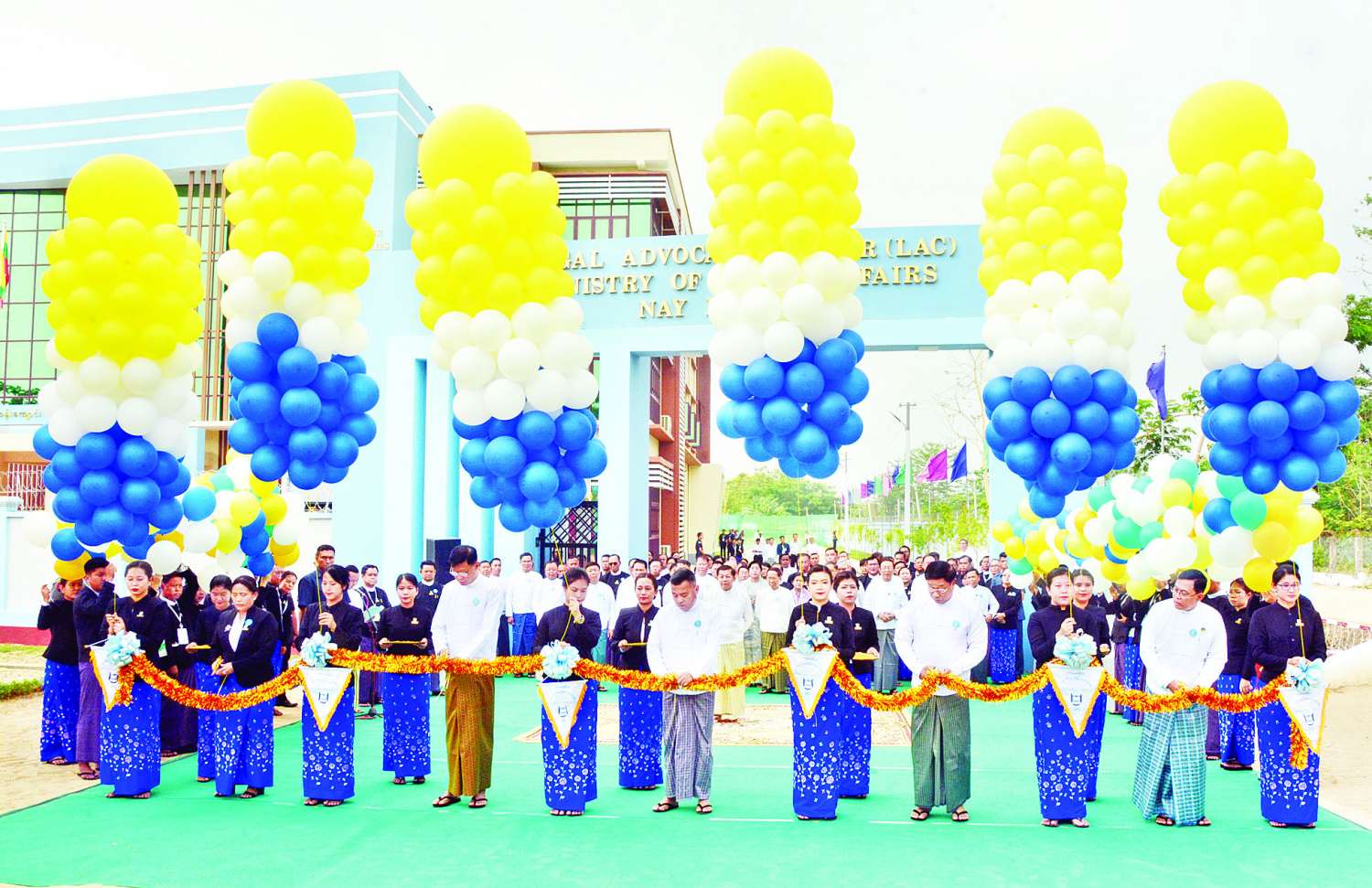 ထို့နောက် နိုင်ငံတော်စီမံအုပ်ချုပ်ရေးကောင်စီဥက္ကဋ္ဌ နိုင်ငံတော်ဝန်ကြီးချုပ်က ဥပဒေအသိပညာ ပြန့်ပွားရေးသင်တန်းကျောင်း LEGAL ADVOCACY CENTER (LAC) ကို စက်ခလုတ်နှိပ်ဖွင့်လှစ်ပေးပြီး အခမ်းအနားတက်ရောက်လာကြသူများနှင့်အတူ စုပေါင်းမှတ်တမ်းတင် ဓာတ်ပုံရိုက်သည်။