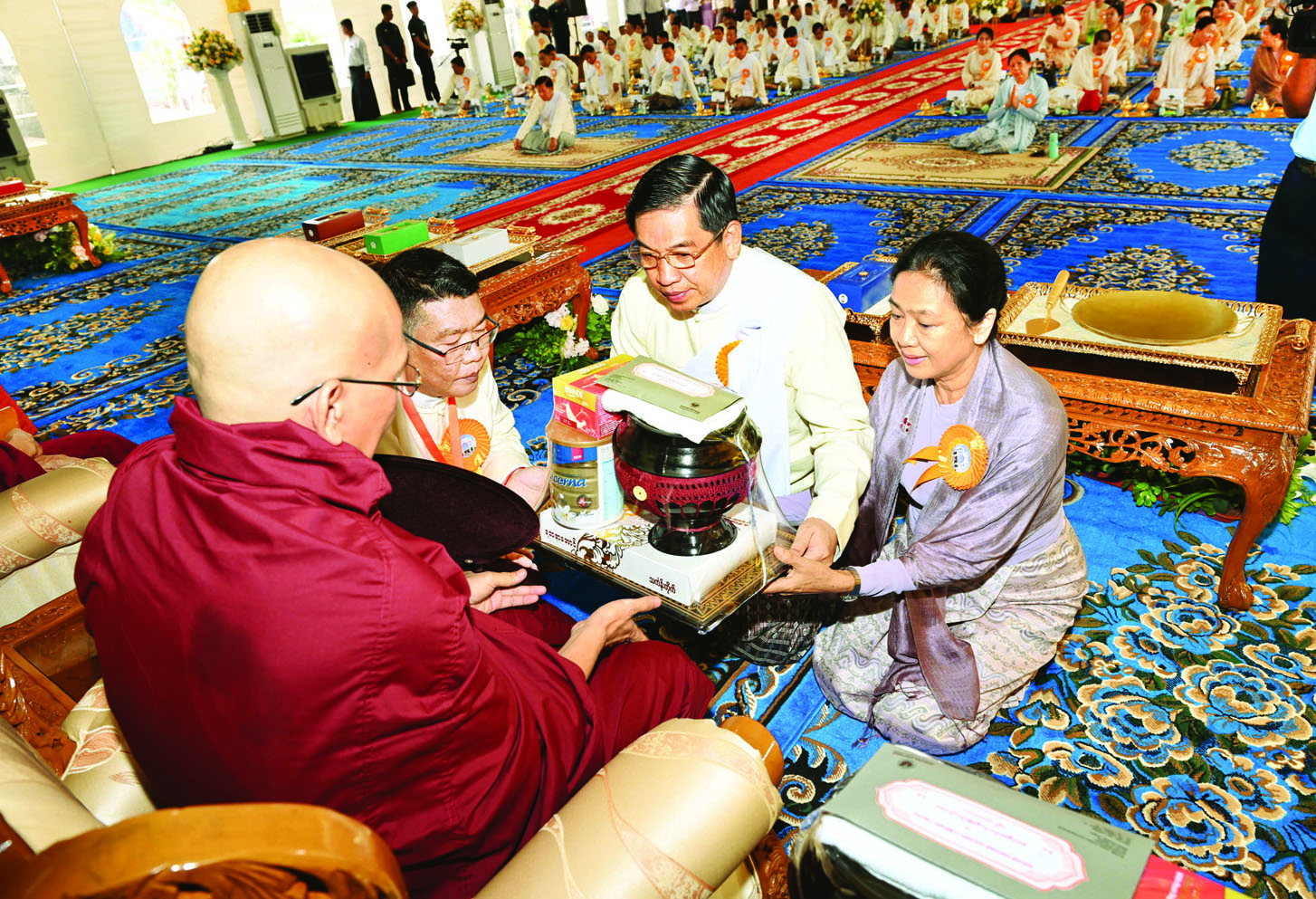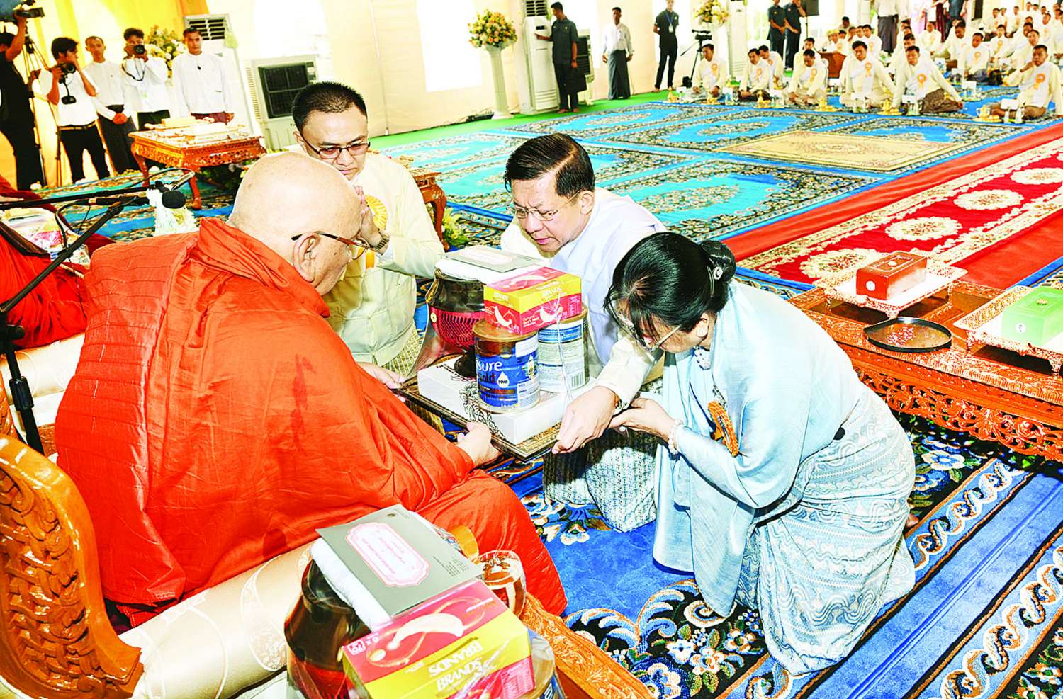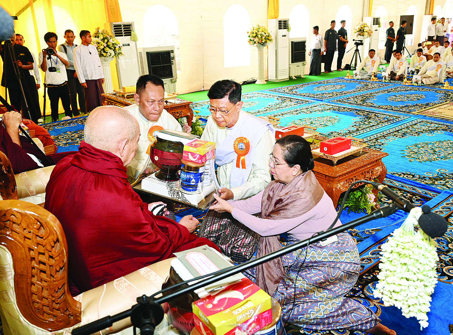 ယင်းနောက် နိုင်ငံတော်စီမံအုပ်ချုပ်ရေးကောင်စီဥက္ကဋ္ဌ နိုင်ငံတော်ဝန်ကြီးချုပ်နှင့် ဇနီး အခမ်းအနားတက်ရောက်လာကြသူများက ဆရာတော်ကြီးများကို နေ့ဆွမ်းဆက် ကပ်လှူဒါန်းခဲ့ကြသည်။