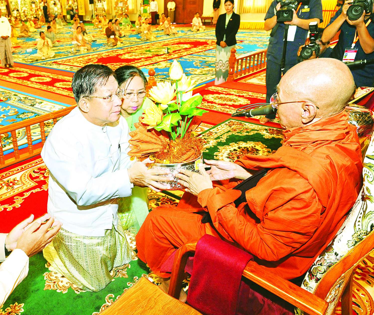 ဦးစွာ နိုင်ငံတော်စီမံအုပ်ချုပ်ရေးကောင်စီဥက္ကဋ္ဌ နိုင်ငံတော်ဝန်ကြီးချုပ်သည် သာသနာ့မဟာဗိမာန်တော်အတွင်းရှိ ဗုဒ္ဓရုပ်ပွားတော်မြတ်အား ဖူးမြော်ကြည်ညို၍ မြသပိတ်ဆွမ်းတော်၊ ပန်း၊ ရေချမ်း၊ ဆီမီးနှင့် သစ်သီးတို့ကို ဆက်ကပ်လှူဒါန်းသည်။
