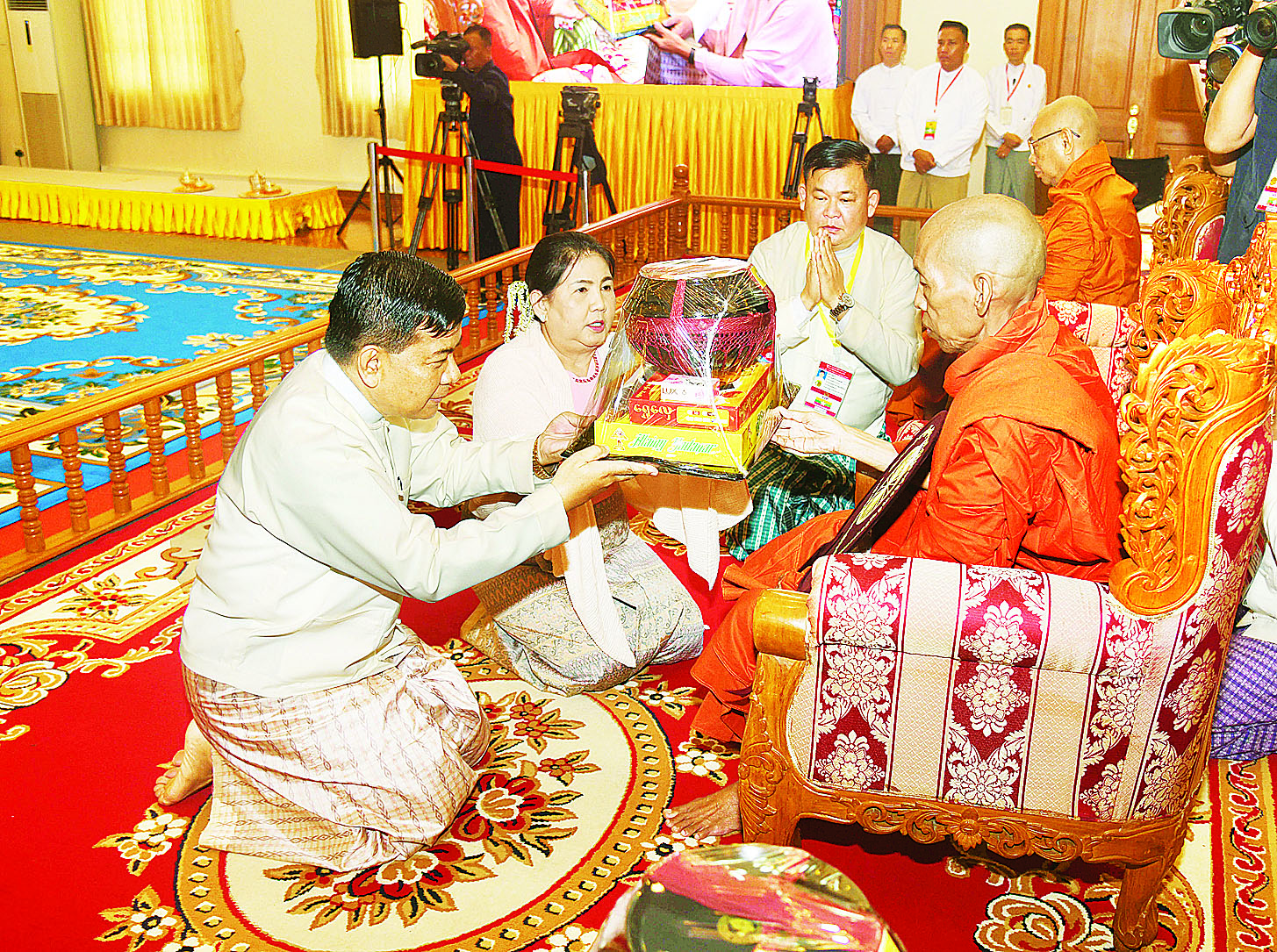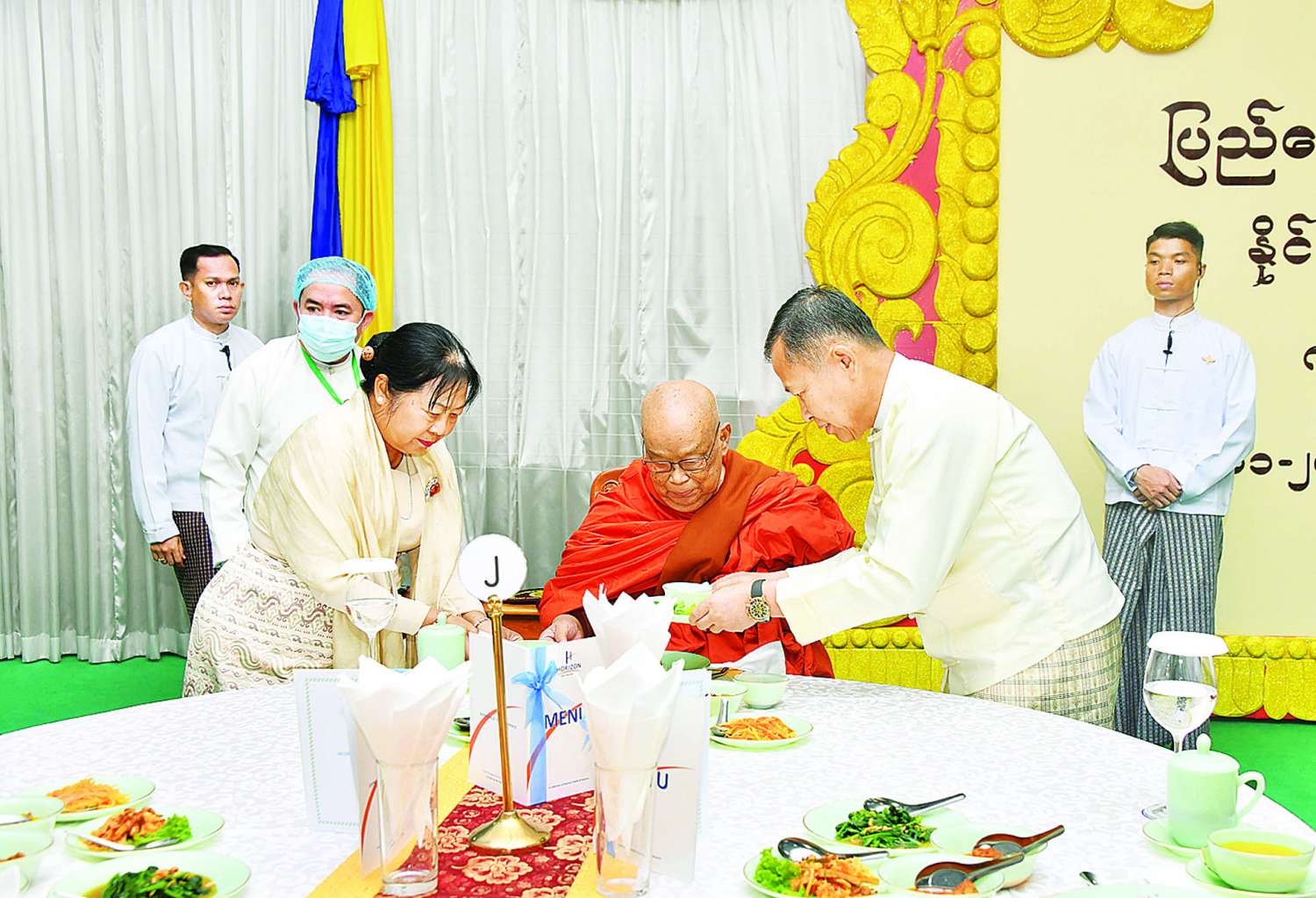 ယင်းနောက် “ဗုဒ္ဓသာသနံ စိရံ တိဋ္ဌတု သုံးကြိမ်ရွတ်ဆိုဆုတောင်း၍ အခမ်းအနားကို ရုပ်သိမ်းလိုက်သည်။ အခမ်းအနားအပြီးတွင် သန်လျင်မင်းကျောင်း ဆရာတော်ကြီးအမှူးပြုသည့် ဆရာတော်၊ သံဃာတော်များအား နိုင်ငံတော်စီမံအုပ်ချုပ်ရေးကောင်စီဥက္ကဋ္ဌနှင့်ဇနီး၊ ဧည့်ပရိသတ်များက နေ့ဆွမ်းဆက်ကပ်လှူဒါန်းခဲ့သည်။