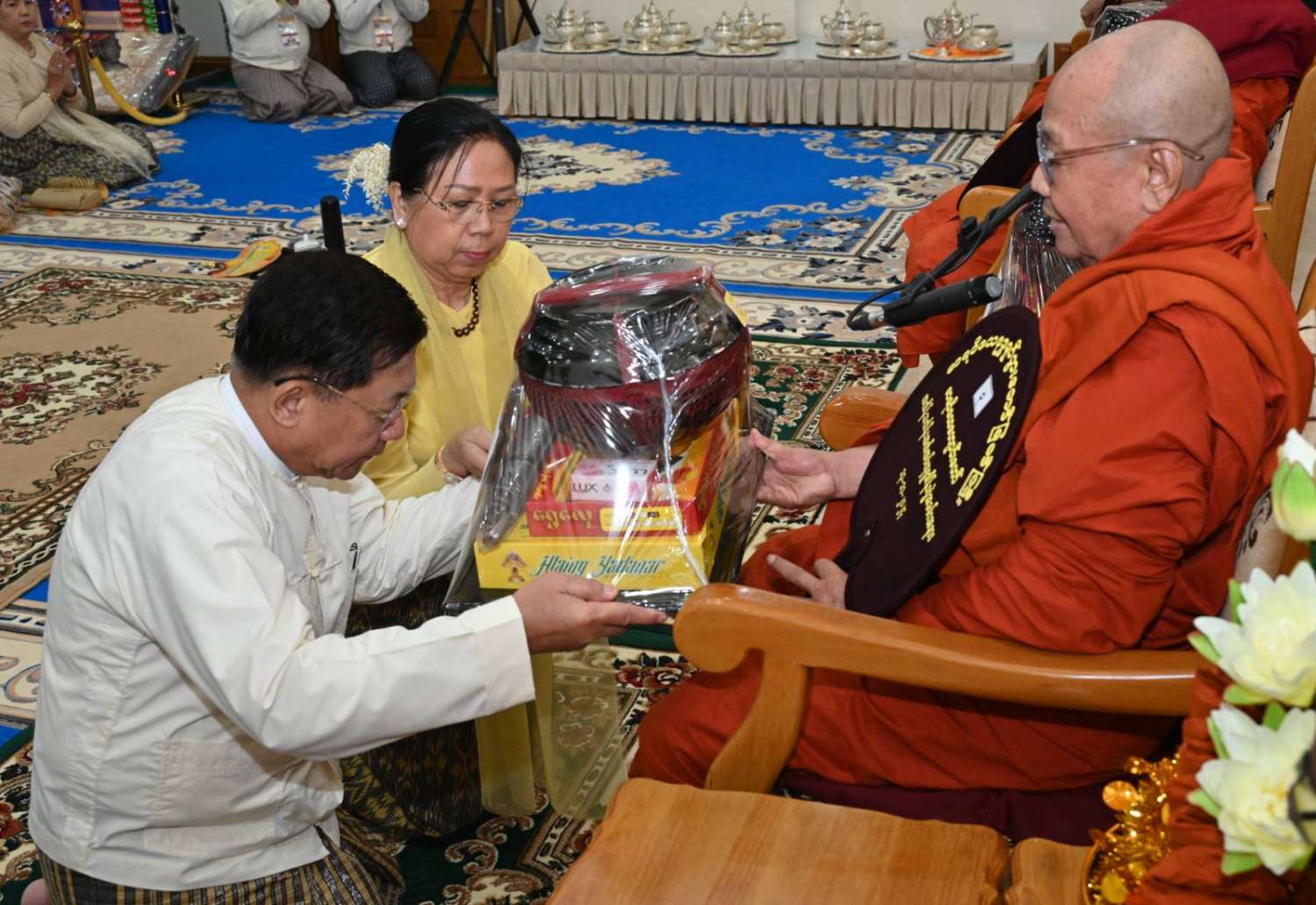 အခမ်းအနားသို့ လယ်ဝေးမြို့၊ ပေါက်မြိုင်ကျောင်းတိုက် ပဓာနနာယက အဘိဓဇ မဟာရဋ္ဌဂုရု ဘဒ္ဒန္တဇနိန္ဒ အမှူးပြုသည့် ဆရာတော်ကြီးများနှင့် မာရဝိဇယကျောင်းတော်တွင် သီတင်းသုံးတော်မူကြသည့် ဆရာတော်ကြီးများ ကြွရောက်ချီးမြှင့်တော်မူကြပြီး နိုင်ငံတော်စီမံအုပ်ချုပ်ရေးကောင်စီဥက္ကဋ္ဌ နိုင်ငံတော်ဝန်ကြီးချုပ် ဗိုလ်ချုပ်မှူးကြီး မင်းအောင်လှိုင်နှင့်ဇနီး ဒေါ်ကြူကြူလှတို့နှင့်အတူ နိုင်ငံတော်စီမံအုပ်ချုပ်ရေးကောင်စီ ဒုတိယဥက္ကဋ္ဌ၊ ဒုတိယဝန်ကြီးချုပ် ဒုတိယဗိုလ်ချုပ်မှူးကြီး စိုးဝင်းနှင့်ဇနီး ဒေါ်သန်းသန်းနွယ်၊ ကောင်စီအတွင်းရေးမှူးနှင့်ဇနီး၊ တွဲဖက်အတွင်းရေးမှူးနှင့်ဇနီး၊ ကောင်စီဝင်များနှင့်ဇနီးများ၊ ပြည်ထောင်စုဝန်ကြီးများနှင့် ဇနီးများ၊ နေပြည်တော်ကောင်စီဥက္ကဋ္ဌ၊ ကာကွယ်ရေးဦးစီးချုပ်ရုံးမှ အဆင့်မြင့်တပ်မတော်အရာရှိကြီးများနှင့်ဇနီးများ၊ နေပြည်တော်တိုင်းစစ်ဌာနချုပ်တိုင်းမှူးနှင့် တာဝန်ရှိသူများ တက်ရောက်ကြသည်။