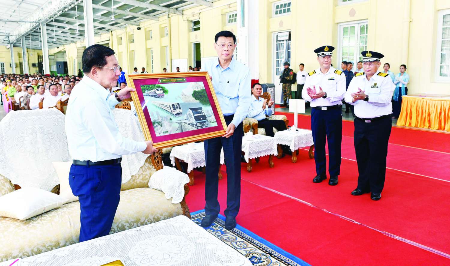 ၎င်းနောက် နိုင်ငံတော်စီမံအုပ်ချုပ်ရေးကောင်စီဥက္ကဋ္ဌ နိုင်ငံတော်ဝန်ကြီးချုပ်ထံ ကောင်စီဝင် ပို့ဆောင်ရေးနှင့်ဆက်သွယ်ရေးဝန်ကြီးဌာန ပြည်ထောင်စုဝန်ကြီးက ရန်ကုန်မြို့ပတ် ရထားလမ်းပိုင်းတွင်ခေတ်မီ Diesel Electric Multiple Unit (DEMU) ရထားတွဲဆိုင်း အသစ်များဖြင့် စတင်ပြေးဆွဲခြင်း ဖွင့်ပွဲအခမ်းအနားအထိမ်းအမှတ် လက်ဆောင်အား ဂါရဝပြုပေးအပ်သည်။