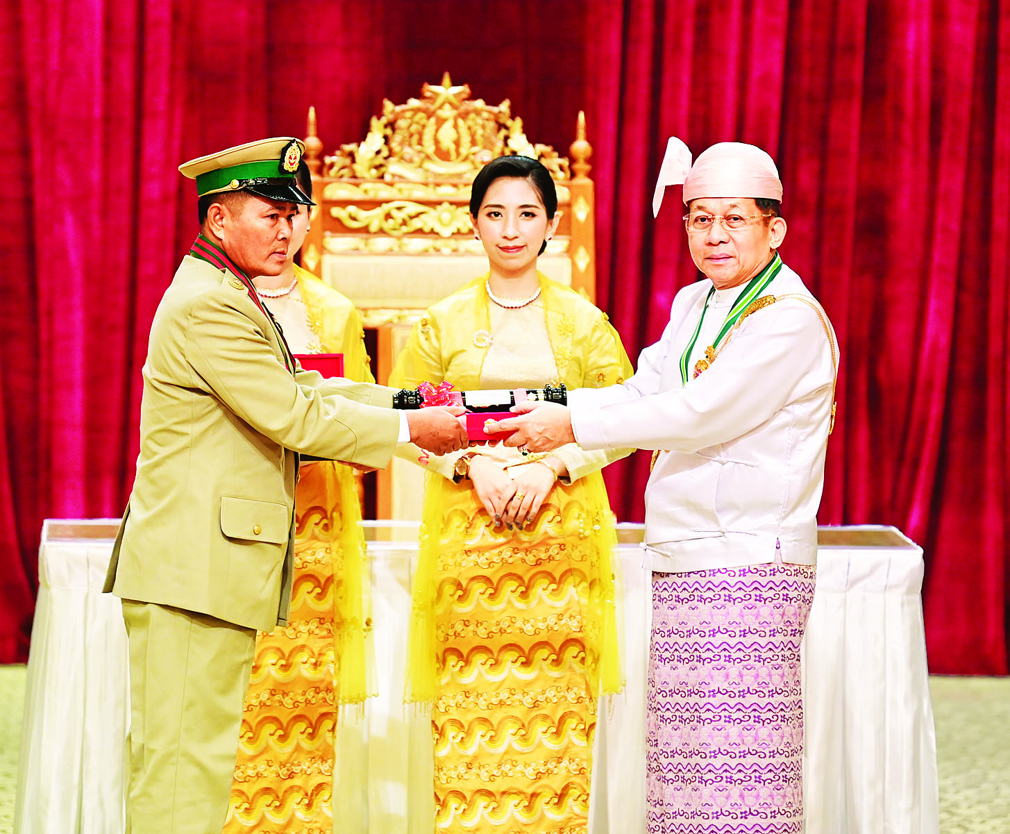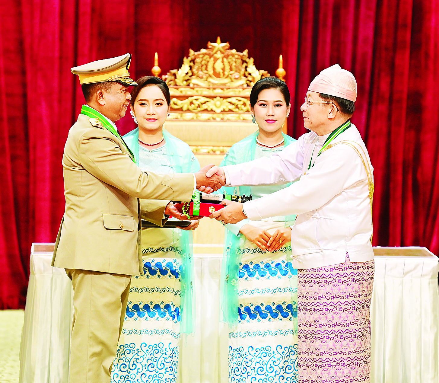 (၇၇) နှစ်မြောက် လွတ်လပ်ရေးနေ့အထိမ်းအမှတ် ဂုဏ်ထူးဆောင်ဘွဲ့များ ချီးမြှင့်အပ်နှင်းခြင်းအခမ်းအနားကို ယနေ့နံနက်ပိုင်းတွင် နိုင်ငံတော်စီမံအုပ်ချုပ်ရေးကောင်စီဥက္ကဋ္ဌရုံး သဘင်ဆောင်၌ကျင်းပရာ နိုင်ငံတော်စီမံအုပ်ချုပ်ရေးကောင်စီဥက္ကဋ္ဌ နိုင်ငံတော်ဝန်ကြီးချုပ် ဗိုလ်ချုပ်မှူးကြီးသတိုးမဟာသရေစည်သူ သတိုးသီရိသုဓမ္မ မင်းအောင်လှိုင် တက်ရောက်အမှာစကားပြောကြားပြီး ဂုဏ်ထူးဆောင်ဘွဲ့များ ချီးမြှင့်အပ်နှင်းသည်။