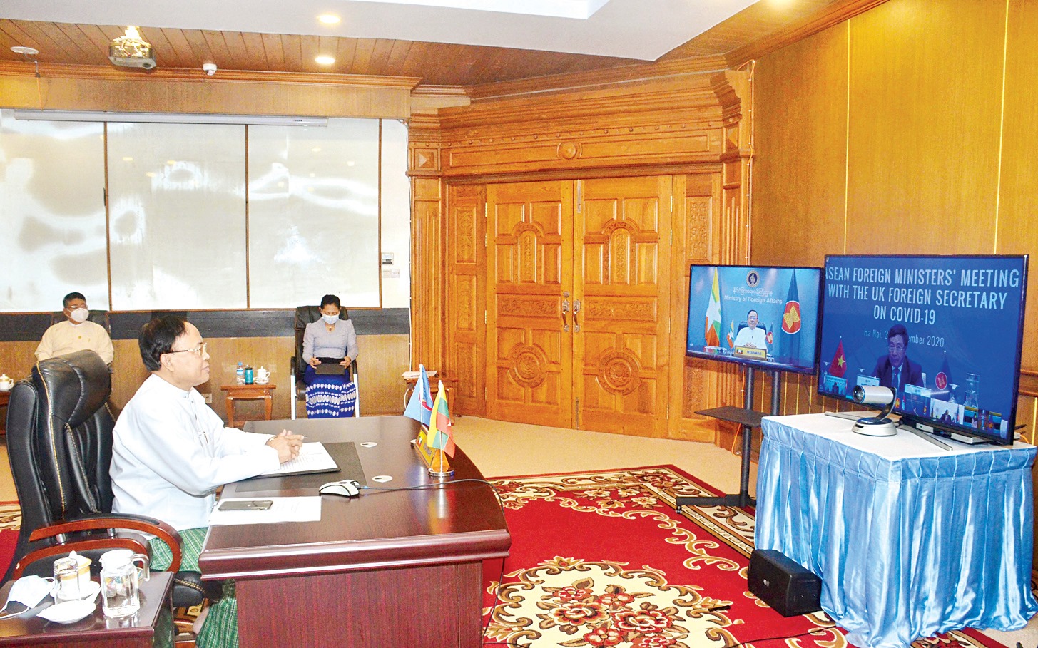 ကိုဗစ်-၁၉ ကူးစက်ရောဂါ၏ စိန်ခေါ်မှုများကို ရင်ဆိုင်ဖြေရှင်းရာတွင် အာဆီယံနှင့် ဗြိတိန်နိုင်ငံတို့အကြား ပူးပေါင်းဆောင်ရွက်မှု တိုးတက်ခိုင်မာရေးကိစ္စနှင့် စပ်လျဉ်း ၍ ပြည်ထောင်စုဝန်ကြီးက ကျန်းမာရေး ဆိုင်ရာ အကျပ် အတည်းနှင့် ကူးစက်ရောဂါကြောင့် ဖြစ်ပေါ်လာသည့် လူမှုစီးပွားထိခိုက်နစ်နာမှုများကို ရင်ဆိုင်ဖြေရှင်း ရာတွင် အာဆီယံနှင့် ဗြိတိန်နိုင်ငံတို့အကြား အတူတကွ လက်တွဲ ဆောင်ရွက်ကြရန်နှင့် ပူးပေါင်းဆောင်ရွက်မှု ပိုမိုတိုးမြှင့်ရန် လိုအပ်ကြောင်း၊ ယခုအချိန်တွင် ကိုဗစ်-၁၉ ကူးစက်ရောဂါ တိုက်ဖျက်ရေးသည် နိုင်ငံအားလုံး၏ အရေးအကြီးဆုံးသော ဦးစားပေးလုပ်ငန်းတစ်ရပ်ဖြစ်သည်နှင့်အညီ ကာကွယ်ဆေး ကို ဆောလျင်စွာ ထုတ်လုပ် နိုင်ရေးနှင့် လက်လှမ်းမီသည့် ဈေးနှုန်းဖြင့် အားလုံးက သာတူညီမျှ ခံစားရရှိနိုင်ရေးမှာ အရေးကြီးကြောင်း အလေး ထားပြောကြားသည်။ ထို့ပြင် ပြည်ထောင်စု ဝန်ကြီးက အတွေ့အကြုံနှင့် အလေ့အကျင့် ကောင်းများ ဖလှယ် နိုင်ရေးအတွက် ဆက်သွယ်ရေးလမ်း ကြောင်းများနှင့် ကုန်သွယ်မှုလမ်းကြောင်းများ ဖွင့်လှစ်ထား ရှိရန်နှင့် ကပ်ရောဂါ အလွန် ကာလတွင် ကမ္ဘာကြီး အနေဖြင့် နဂိုမူလ အနေအထားသို့ အလျင်အမြန် ပြန်လည်ရောက်ရှိနိုင် ရေးနှင့် စဉ်ဆက်မပြတ် ဖွံ့ဖြိုးတိုးတက်ရေးတို့အတွက် သဘာဝပတ်ဝန်းကျင် ထိခိုက်မှုအနည်းဆုံးဖြစ်စေမည့် နည်းလမ်း များဖြင့် ပြန်လည်ထူထောင်ရေးလုပ်ငန်းများ ပူးပေါင်းဆောင်ရွက်မှု တိုးမြှင့်သွားကြရန် အရေးကြီး ကြောင်း ပြောကြားသည်။