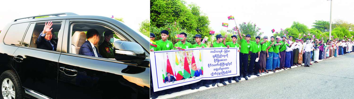 ထို့ပြင် နိုင်ငံတော်စီမံအုပ်ချုပ်ရေးကောင်စီဥက္ကဋ္ဌ နိုင်ငံတော်ဝန်ကြီးချုပ် ဦးဆောင်သည့် မြန်မာချစ်ကြည်ရေးကိုယ်စားလှယ်အဖွဲ့သည် နေပြည်တော်မှ ရုရှားဖက်ဒရေးရှင်းနိုင်ငံ နိုဗိုစီဗစ်မြို့၊ မော်စကိုမြို့၊ စိန့်ပီတာစဘတ်မြို့၊ ဆာမားရားမြို့နှင့် ဘယ်လာရုစ်သမ္မတနိုင်ငံ မင့်စ်မြို့များသို့ သွားရောက်ခဲ့ပြီး မိမိတို့မြန်မာနိုင်ငံနှင့် ရာသီဥတုအနေအထားကွာဟချက်အရ အပူချိန်အနုတ် ၂ မှ အနုတ် ၁၂ ဒီဂရီ စင်တီဂရိတ် (အေးခဲသော) အနေအထားအထိရှိသည့် ရုရှား ဖက်ဒရေးရှင်းနိုင်ငံနှင့် ဘယ်လာရုစ်သမ္မတနိုင်ငံတို့သို့ အသွားအပြန် မိုင်ပေါင်းတစ်သောင်းကျော်ခန့်အထိ သွားရောက်၍ နိုင်ငံတော်အကျိုးစီးပွားကို တစိုက်မတ်မတ် ဦးတည်ပြီး ခရီးစဉ်အတွင်း နေ့မအား ညမနားဖြင့် နိုင်ငံများအကြား စိုက်ပျိုးရေးကဏ္ဍ၊ စီးပွားရေးကဏ္ဍ၊ ကုန်သွယ်ရေးကဏ္ဍ၊ ပညာသင်ကြားမှု မြှင့်တင်ရေးဆိုင်ရာကိစ္စ၊ ခရီးသွားကဏ္ဍများ တိုးမြှင့်ရေးဆိုင်ရာကိစ္စများတွင် ပြည်သူအချင်းချင်း၊ လုပ်ငန်းရှင်များအချင်းချင်း ပူးပေါင်းဆောင်ရွက်နိုင်မည့်အခွင့်အလမ်းများ ပေါ်ပေါက်လာစေရေးအတွက် ကြိုးပမ်းအားထုတ်ဆောင်ရွက်ခဲ့ကြသည့် နိုင်ငံတော် စီမံအုပ်ချုပ်ရေးကောင်စီဥက္ကဋ္ဌ နိုင်ငံတော်ဝန်ကြီးချုပ် ဦးဆောင်သည့် မြန်မာအဆင့်မြင့်ကိုယ်စားလှယ်အဖွဲ့အား ဂုဏ်ပြုကြိုဆိုသောအားဖြင့် တိုင်းရင်းသား၊ တိုင်းရင်းသူ သားငယ်၊ သမီးငယ်လေးများ၊ ဘင်ခရာ၊ ပန်းဖွားအကအဖွဲ့များ၊ ရိုးရာအကအဖွဲ့များ၊ အနုပညာရှင်များ၊ ဒေသခံပြည်သူများက လေဆိပ်တွင် အသင့်စောင့်ကြို၍ လေယာဉ်အဆင်းမှ VIP ဆောင်အထိလည်းကောင်း၊ တပ်မတော်လေဆိပ်မှ အဝိုင်းပတ်နေရာအထိလည်းကောင်း “ရုရှား-မြန်မာ နှစ်နိုင်ငံအကြား ချစ်ကြည်ရင်းနှီးမှု အဓွန့်ရှည်ပါစေ၊ ရုရှား-မြန်မာ နှစ်နိုင်ငံအကြား ဘက်စုံမဟာဗျူဟာမြောက် ပူးပေါင်းဆောင်ရွက်ရေးကဏ္ဍအလိုက် တိုးမြှင့်ဆောင်ရွက်နိုင်ပါစေ၊ ရုရှား-မြန်မာ နှစ်နိုင်ငံဆက်ဆံရေး ပိုမိုတိုးတက်အောင် ဆောင်ရွက်ခဲ့သည့် နစကဥက္ကဋ္ဌ နိုင်ငံတော်ဝန်ကြီးချုပ် ဗိုလ်ချုပ်မှူးကြီး မင်းအောင်လှိုင်အား လှိုက်လှဲစွာ ကြိုဆိုပါသည်၊ ရုရှားမြန်မာ ချစ်ကြည်စွာ တွဲလက်မြဲပါစေ၊ မြန်မာ-ရုရှားပူးပေါင်းအား မုချအောင်မြင်ပါစေ၊ ဘယ်လာရုစ်- မြန်မာချစ်ကြည်ရေး အဓွန့်ရှည်တည်တံ့ပါစေ၊ မြန်မာနိုင်ငံ ဘက်စုံဖွံ့ဖြိုးတိုးတက်ရေးအတွက် ကြိုးပမ်းဆောင်ရွက်ခဲ့သော ဗိုလ်ချုပ်မှူးကြီး မင်းအောင်လှိုင်အား လှိုက်လှဲစွာ ကြိုဆိုပါ၏၊ ရုရှား-မြန်မာ ချစ်ကြည်ရေးကို ခိုင်မြဲစေသော နိုင်ငံတော်ဝန်ကြီးချုပ်နှင့် အဖွဲ့ဝင်များအား လှိုက်လှဲစွာ ကြိုဆိုပါ၏” ဟူသော စာတန်းများပါရှိသည့် ဗွီနိုင်း