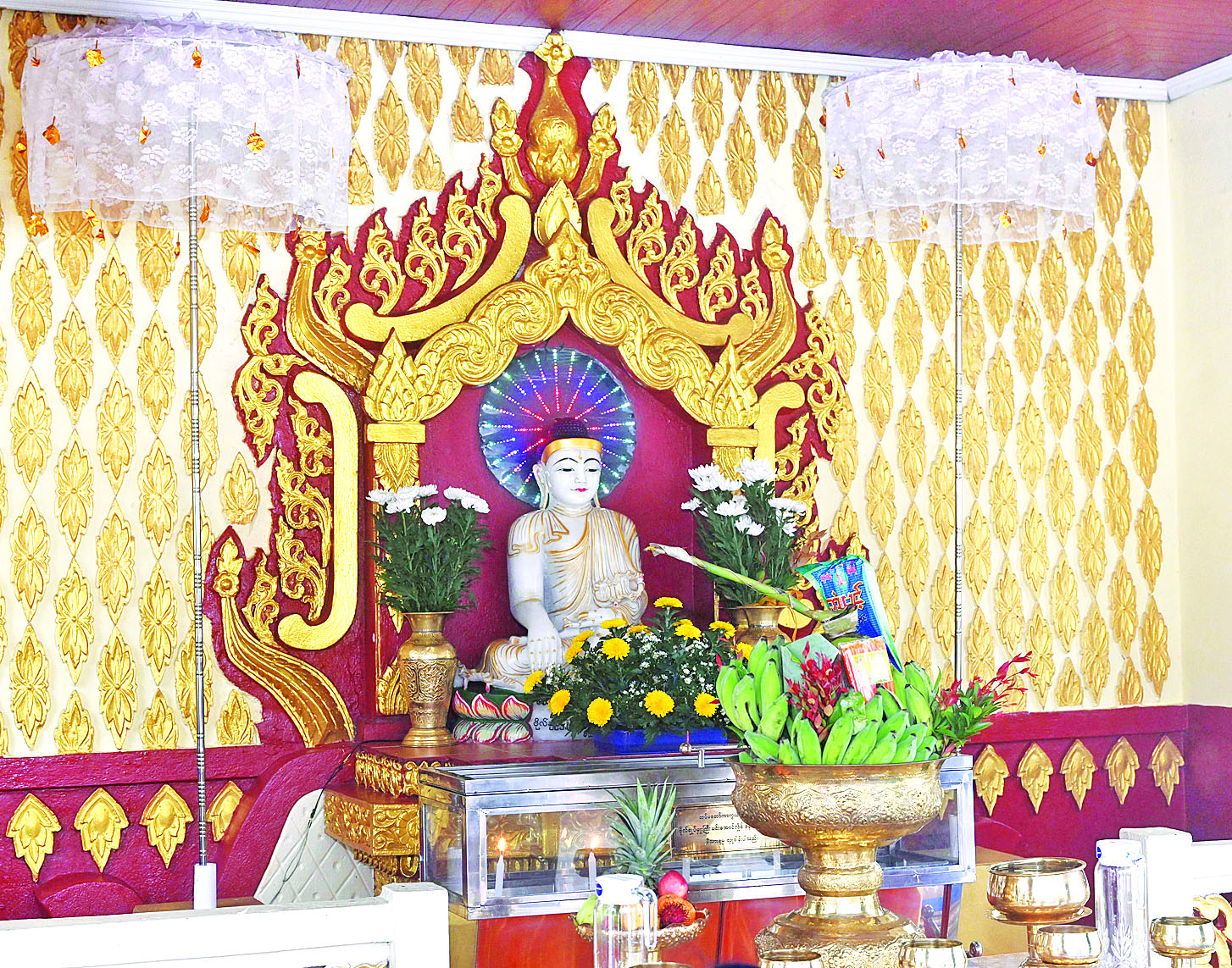 နိုင်ငံတော်စီမံအုပ်ချုပ်ရေးကောင်စီဥက္ကဋ္ဌနိုင်ငံတော်ဝန်ကြီးချုပ်နှင့် ဇနီး၊ အဖွဲ့ဝင်များသည် လွိုင်မွေတောင်စခန်းမြို့ရှိ စတုရဋ္ဌသုမင်္ဂလစေတီတော်သို့ ရောက်ရှိကြပြီး စေတီတော်မြတ်အား ဖူးမြော်ကြည်ညိုကာ ပန်း၊ ရေချမ်း၊ ဆီမီးကပ်လှူပူဇော်သည်။ ယင်းနောက် နိုင်ငံတော်စီမံအုပ်ချုပ်ရေးကောင်စီဥက္ကဋ္ဌ နိုင်ငံတော်ဝန်ကြီးချုပ်နှင့် ဇနီးတို့သည် စေတီတော်ဓမ္မာရုံတော်အတွင်းရှိ ဗုဒ္ဓရုပ်ပွားတော်မြတ်အား ဖူးမြော်ကြည်ညိုသည်။