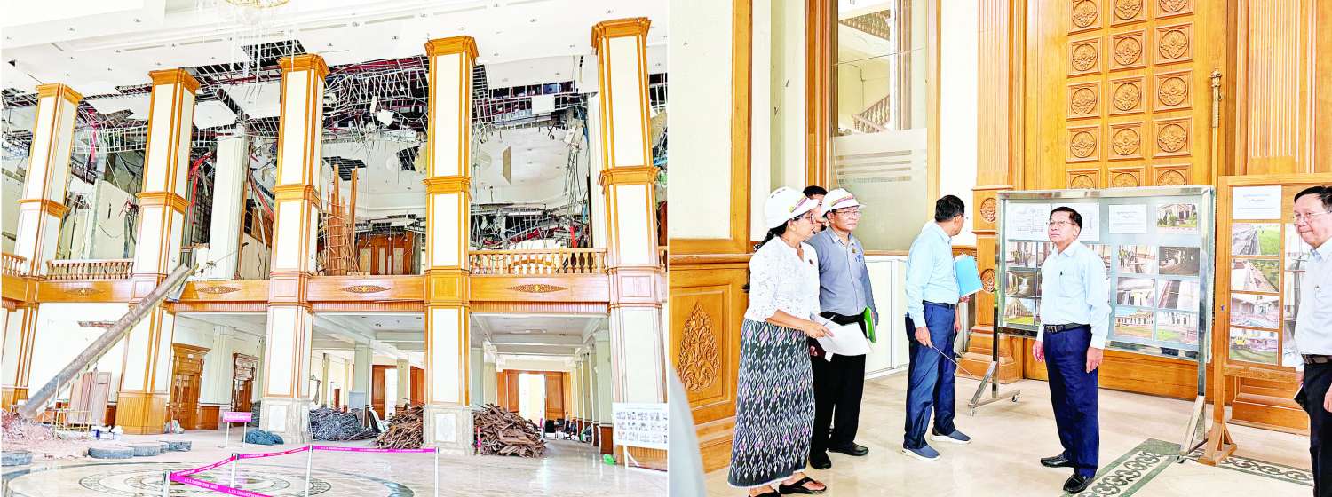 ရှင်းလင်းတင်ပြမှုများအပေါ် နိုင်ငံတော်စီမံအုပ်ချုပ်ရေးကောင်စီဥက္ကဋ္ဌ နိုင်ငံတော်ဝန်ကြီးချုပ်က ထိခိုက်ပျက်စီးမှုများဖြစ်ပေါ်ခဲ့သည့် လွှတ်တော်အဆောက်အဦများအား စနစ်တကျဖြင့် ဖြစ်နိုင်သမျှ အမြန်ဆုံးပြန်လည်ပြုပြင်တည်ဆောက်သွားရန်နှင့် ပြင်ဆင်ခြင်းလုပ်ငန်းများကို သတ်မှတ်ကာလအတွင်း အချိန်မီပြီးစီးအောင်ဆောင်ရွက်သွားရန်လိုကြောင်း၊ ရေရှည်ခိုင်ခံ့တည်တံ့စေရေးနှင့် ခိုင်ခိုင်မာမာဖြစ်စေရေးအတွက် နည်းပညာကျွမ်းကျင်သူများနှင့် ဆောက်လုပ်ရေးလုပ်ငန်းများ ဆောင်ရွက်သွားရန်နှင့် အရည်အသွေးပြည့်မီသည့် ဆောက်လုပ်ရေးလုပ်ငန်းသုံးပစ္စည်းများအား အသုံးပြုသွားရန်လိုကြောင်းနှင့် အခြားလိုအပ်သည်များကို လမ်းညွှန်မှာကြားခဲ့ကြောင်း သတင်းရရှိသည်။