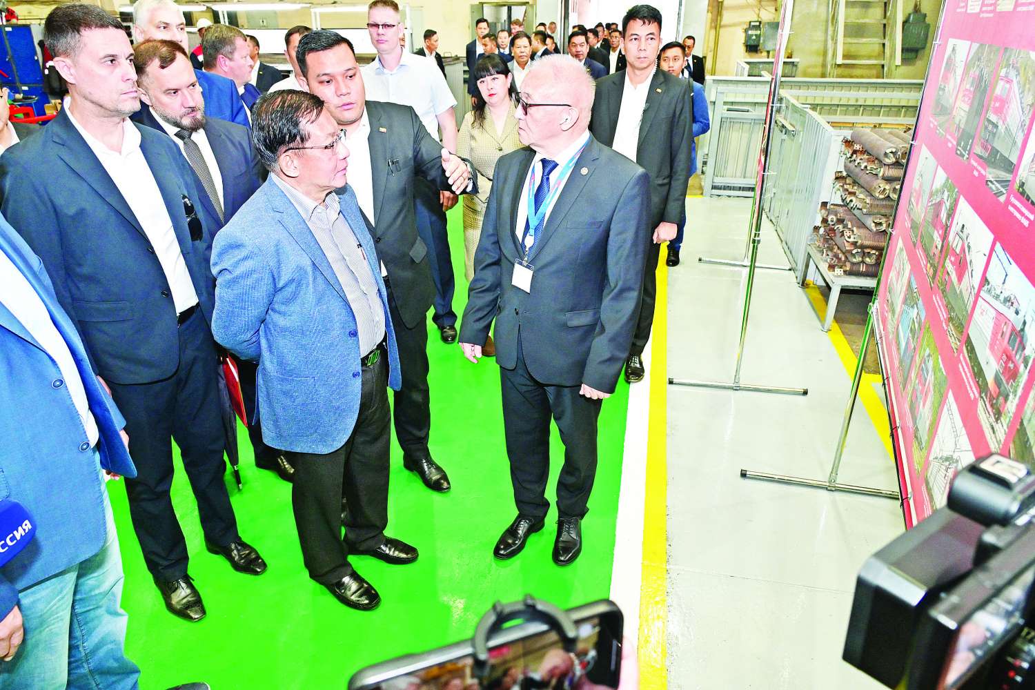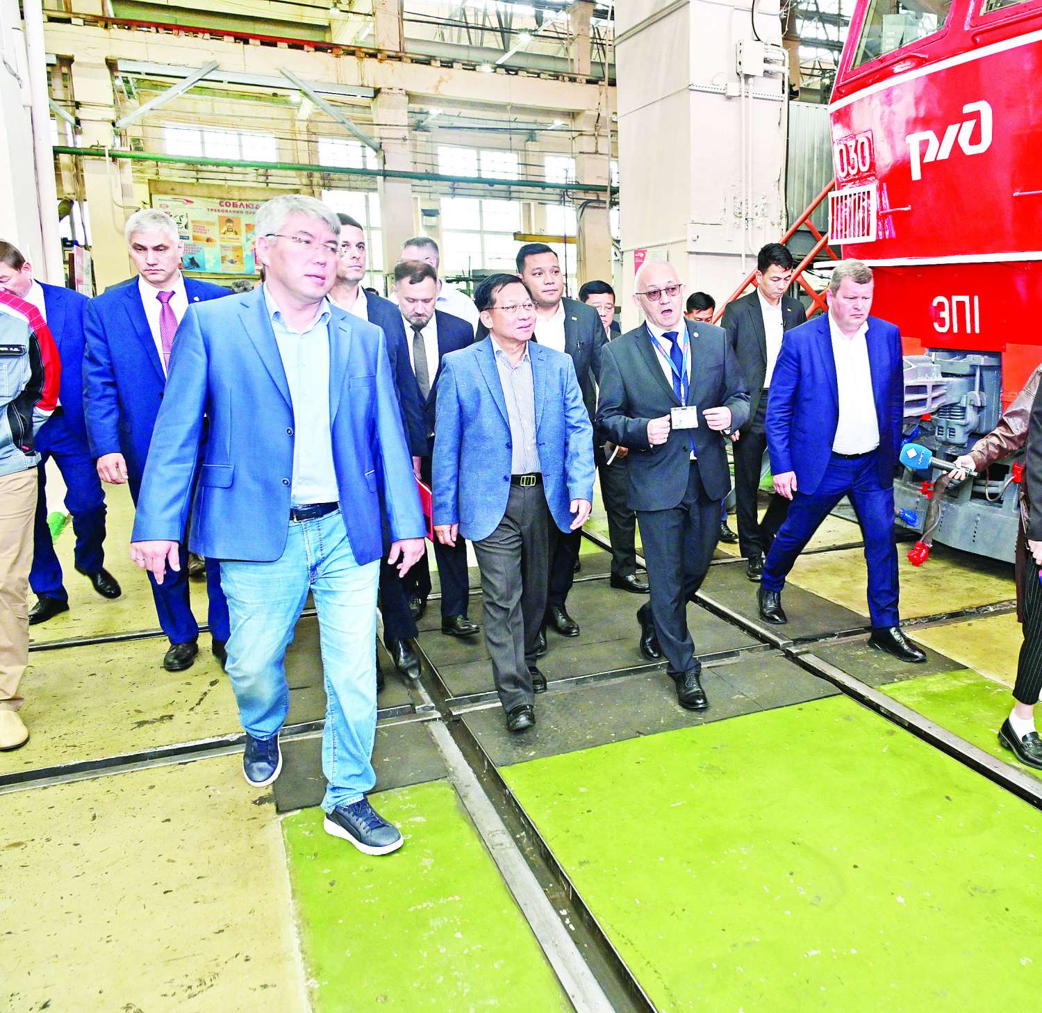 ဆက်လက်၍ နိုင်ငံတော်စီမံအုပ်ချုပ်ရေးကောင်စီဥက္ကဋ္ဌ နိုင်ငံတော်ဝန်ကြီးချုပ်နှင့် အဖွဲ့ဝင်များသည် Ulan-Ude LVRZ မီးရထားစက်ခေါင်းနှင့် ရထားတွဲပြုပြင်ရေး စက်ရုံသို့ရောက်ရှိရာ စက်ရုံအကြီးအကဲ Zaborskikh Sergey Alexandrovich နှင့် တာဝန်ရှိသူများက ကြိုဆိုနှုတ်ဆက်ကြသည်။ ယင်းနောက် နိုင်ငံတော်စီမံအုပ်ချုပ်ရေးကောင်စီဥက္ကဋ္ဌ နိုင်ငံတော်ဝန်ကြီးချုပ်နှင့်အဖွဲ့ဝင်များသည် စက်ရုံအတွင်း ပြုပြင်ရေးလုပ်ငန်းများ အဆင့်ဆင့်ဆောင်ရွက်နေမှုကို လိုက်လံကြည့်ရှုလေ့လာကြပြီး ရှင်းလင်းတင်ပြမှုများအပေါ် သိရှိလိုသည်များ ပြန်လည်မေးမြန်းဆွေးနွေးသည်။