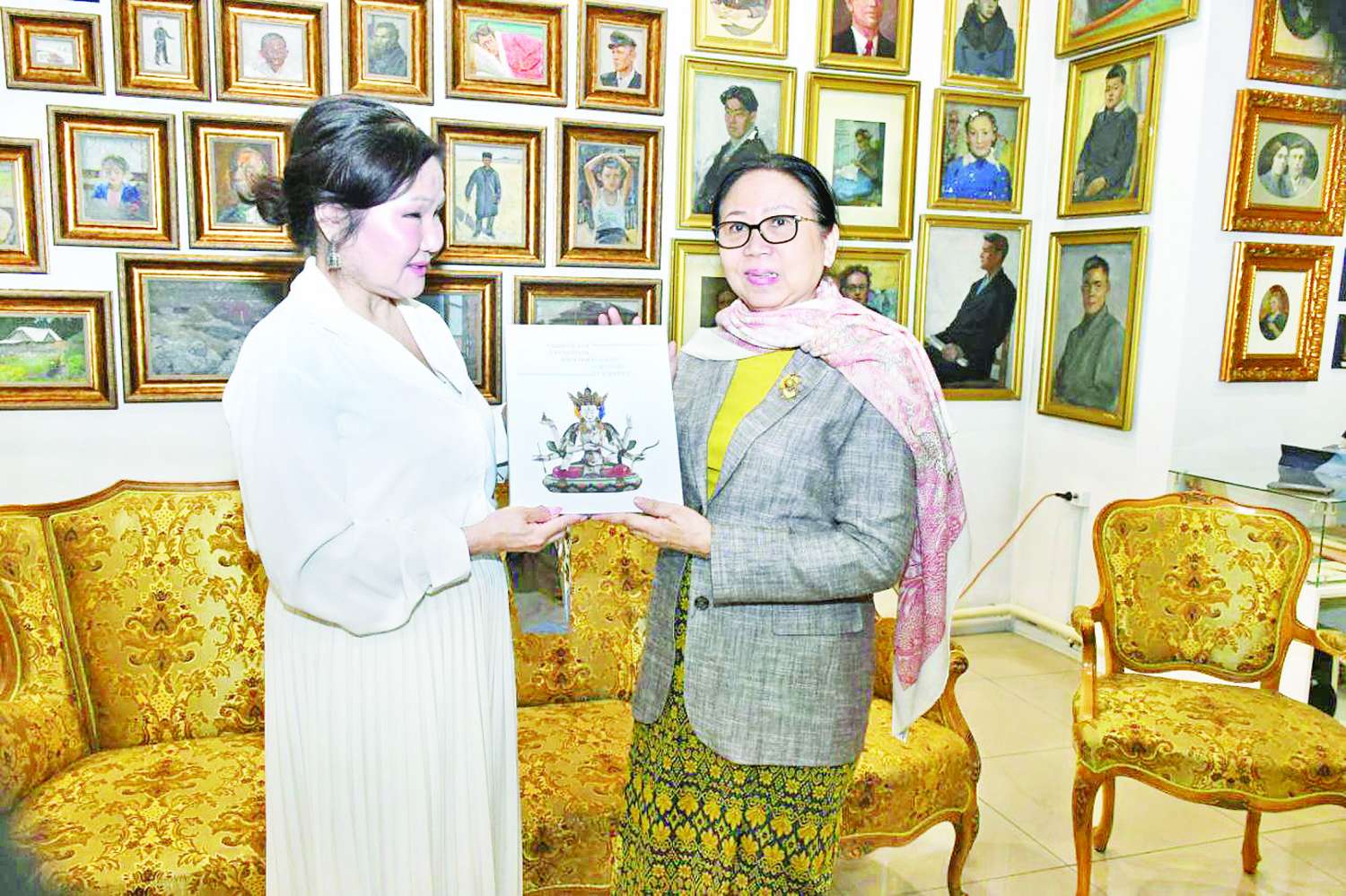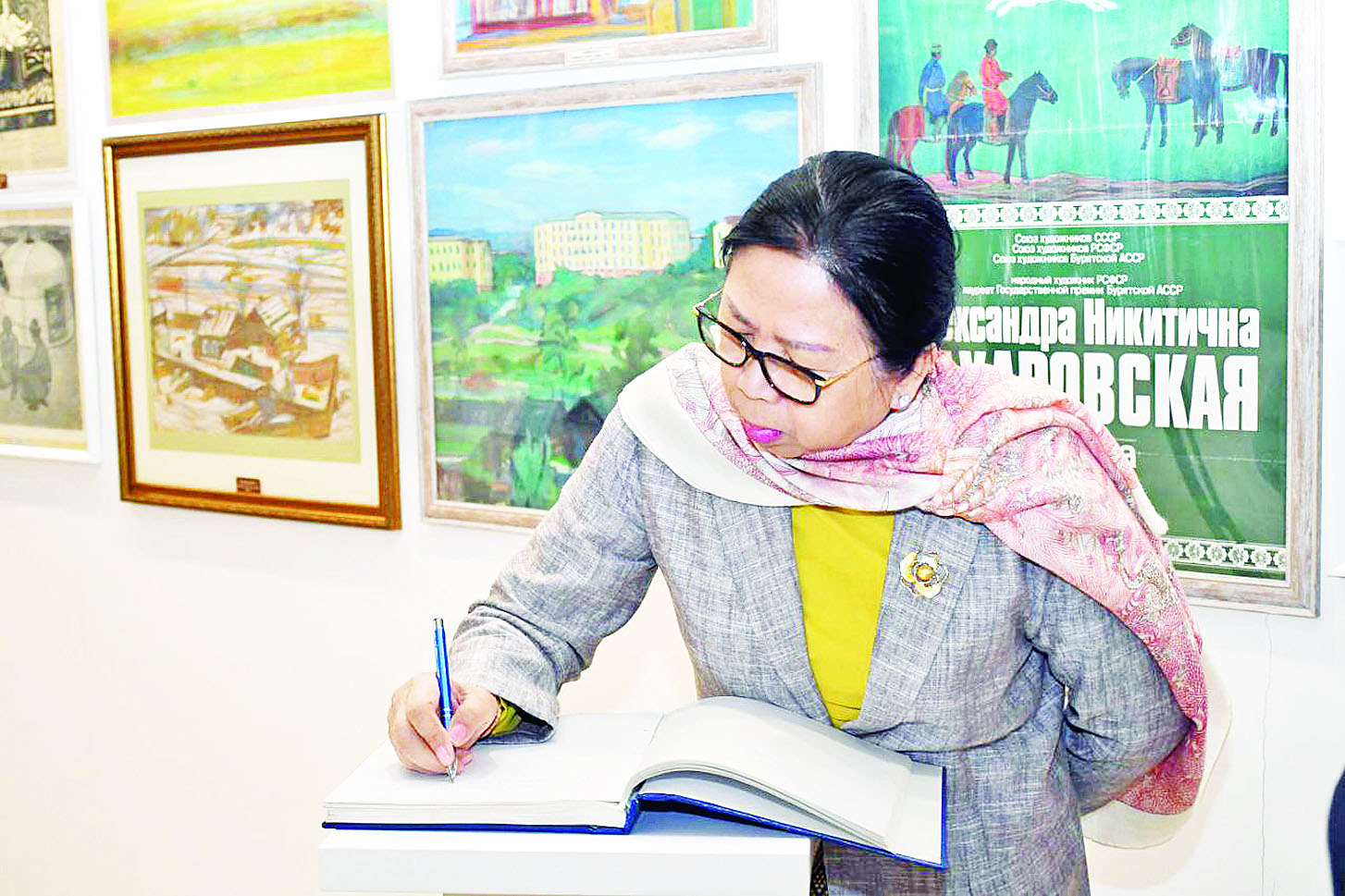 ဦးစွာ နိုင်ငံတော်စီမံအုပ်ချုပ်ရေးကောင်စီဥက္ကဋ္ဌ နိုင်ငံတော်ဝန်ကြီးချုပ်၏ဇနီး ဦးဆောင်သောကိုယ်စားလှယ်အဖွဲ့အား Buryatia ပြည်နယ် ဒုတိယအကြီးအကဲ Ms. Evgenia Yurievna Ludupova နှင့် Leo Bardamov ပြတိုက်မှတာဝန်ရှိသူများက ကြိုဆိုနှုတ်ဆက်ကြသည်။