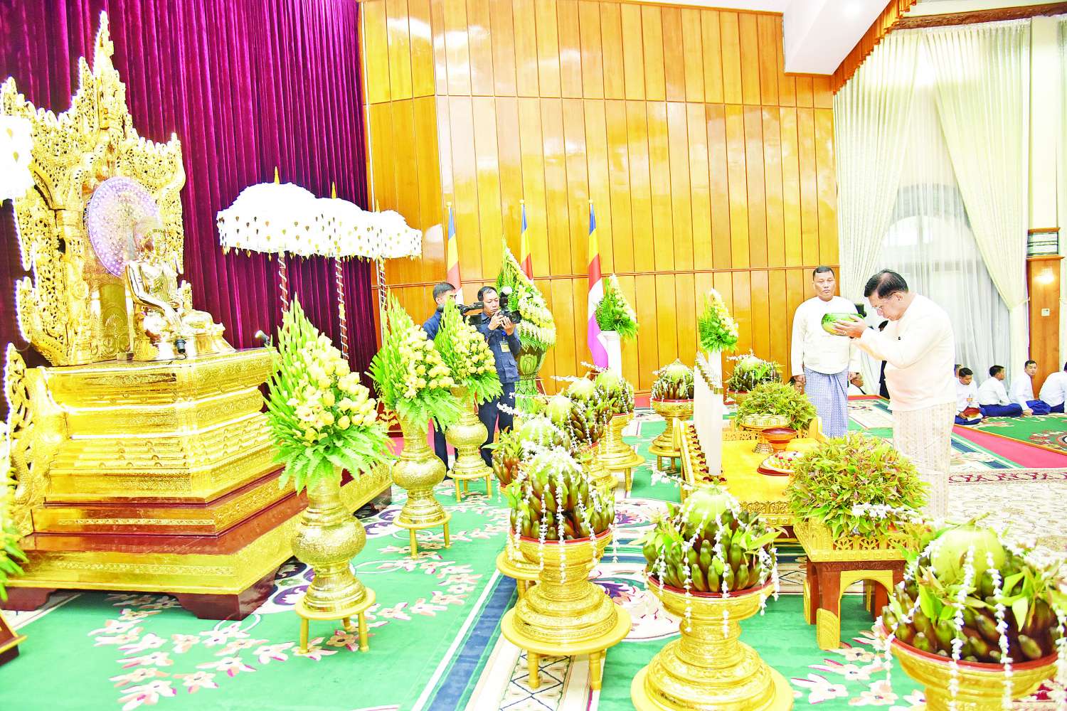 ဦးစွာ နိုင်ငံတော်စီမံအုပ်ချုပ်ရေးကောင်စီဥက္ကဋ္ဌ တပ်မတော်ကာကွယ်ရေးဦးစီးချုပ်က အနော်ရထာခန်းမအတွင်းရှိ ဗုဒ္ဓရုပ်ပွားတော်မြတ်အား ဖူးမြော်ကြည်ညို၍ မြသပိတ်ဆွမ်းတော်၊ သစ်သီး၊ ပန်းမန်၊ သောက်တော်ရေချမ်းနှင့် ဆီမီးတို့ကို ကပ်လှူပူဇော်သည်။