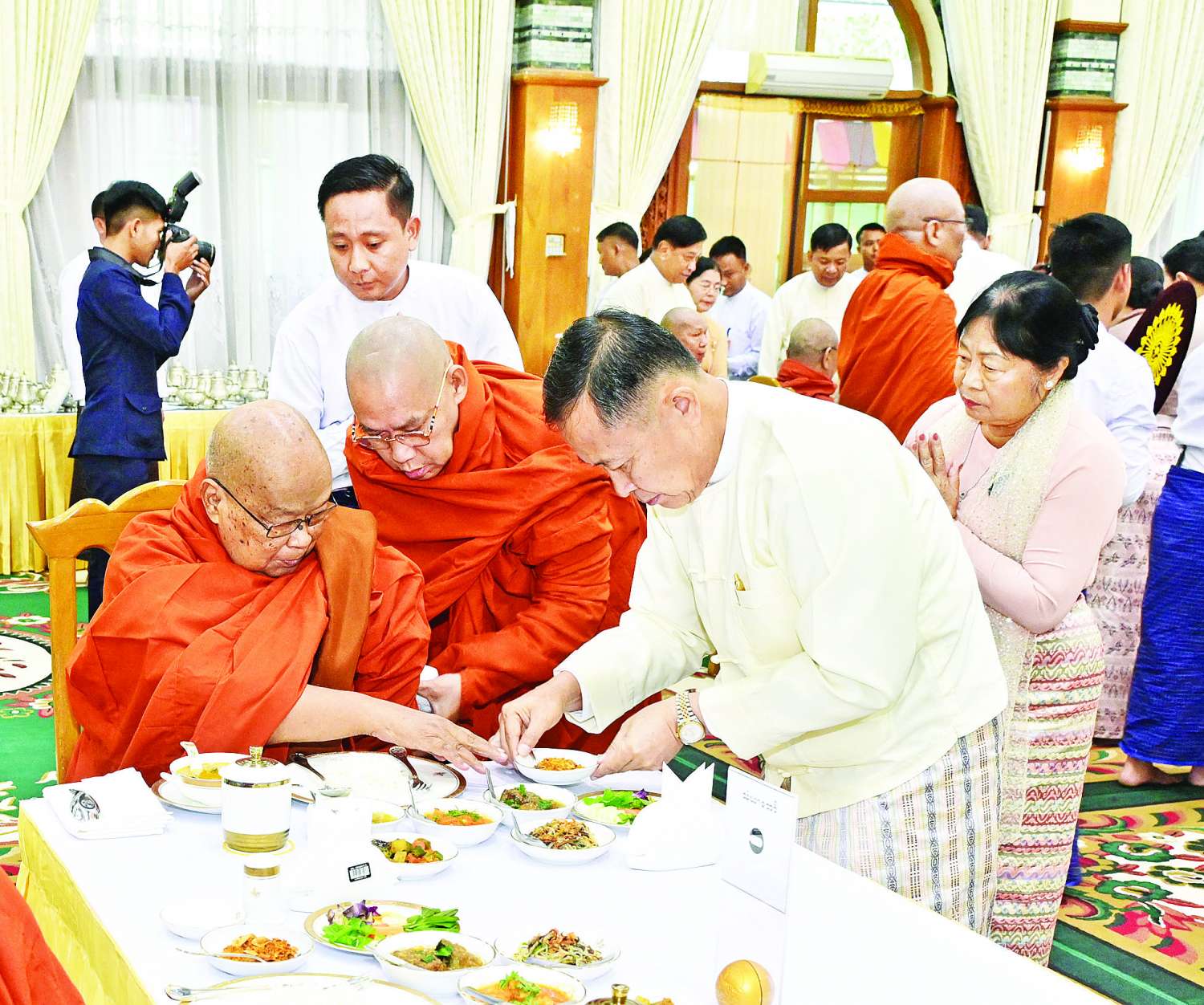 ၂၀၂၅ ခုနှစ်၊ ကာကွယ်ရေးဦးစီးချုပ်ရုံး (ကြည်း၊ ရေ၊ လေ) မိသားစုများ ဝါဆိုသင်္ကန်းဆက်ကပ်လှူဒါန်းပွဲ မင်္ဂလာအခမ်းအနားကို ယနေ့နံနက်ပိုင်းတွင် ကာကွယ်ရေးဦးစီးချုပ်ရုံး (ကြည်း)၊ အနော်ရထာခန်းမ၌ ကျင်းပပြုလုပ်ရာ နိုင်ငံတော်စီမံအုပ်ချုပ်ရေးကောင်စီဥက္ကဋ္ဌ တပ်မတော်ကာကွယ်ရေးဦးစီးချုပ် ဗိုလ်ချုပ်မှူးကြီး မင်းအောင်လှိုင်နှင့် ဇနီး ဒေါ်ကြူကြူလှတို့ တက်ရောက်ကြည်ညို၍ ဝါဆိုသင်္ကန်း၊ လှူဖွယ်ပစ္စည်းများနှင့် နေ့ဆွမ်းတို့ကို ဆက်ကပ်လှူဒါန်းသည်။
