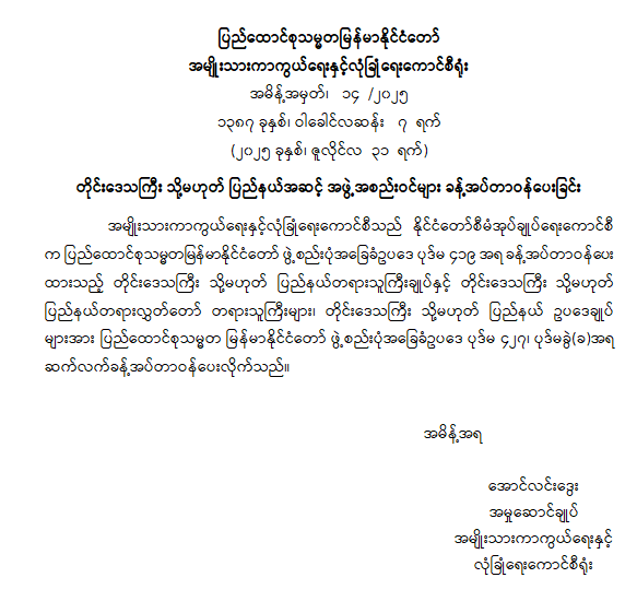ရန်ကုန်မြို့နှင့် မန္တလေးမြို့အတွက် ရည်ညွှန်းလက်ကားဈေးနှုန်းများနှင့် ပြည်ထောင်စုနယ်မြေ နေပြည်တော်၊ တိုင်းဒေသကြီး/ပြည်နယ် မြို့တော်များအတွက် ရည်ညွှန်းလက်လီဈေးနှုန်းများ