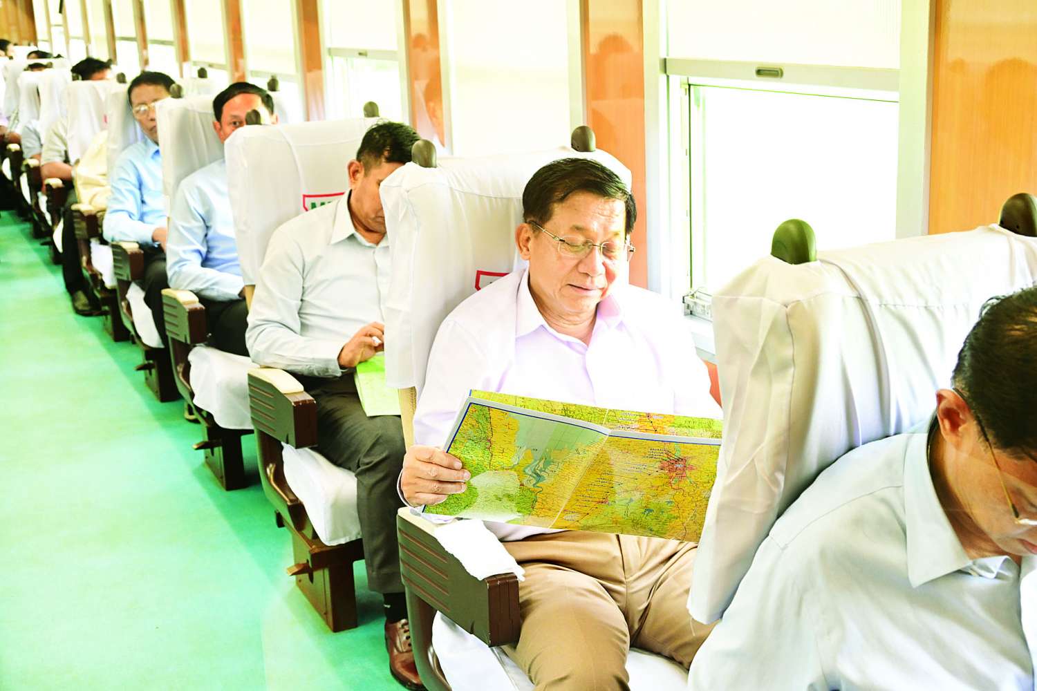 ယင်းနောက် နိုင်ငံတော်လုံခြုံရေးနှင့် အေးချမ်းသာယာရေးကော်မရှင်ဥက္ကဋ္ဌနှင့် ဇနီး ဒေါ်ကြူကြူလှ၊ ခရီးစဉ်တွင်လိုက်ပါလာကြသည့် အဖွဲ့ဝင်များသည် နေပြည်တော်မှ ထွက်ခွာလာသည့် နေပြည်တော် - ရန်ကုန် အမှတ် (၈) အစုန် DEMU လူစီးအမြန်ရထားပေါ်တွင် စီးနင်းလိုက်ပါလာသည့် ခရီးသွားပြည်သူများနှင့်အတူ တောင်ငူဘူတာမှ ရန်ကုန်ဘူတာကြီးအထိ ရထားလမ်းပိုင်းတစ်လျှောက် လိုက်ပါစီးနင်းသည်။