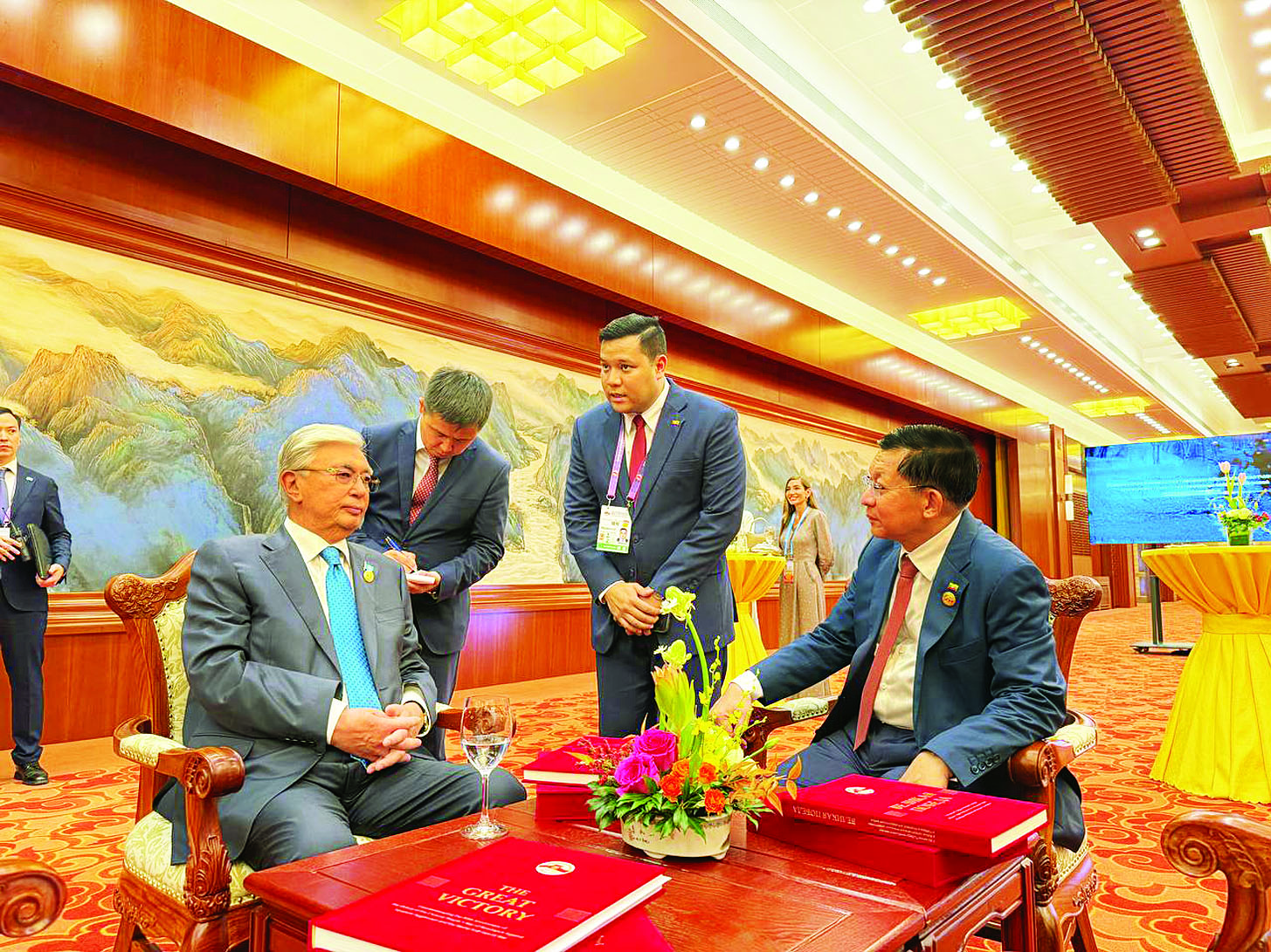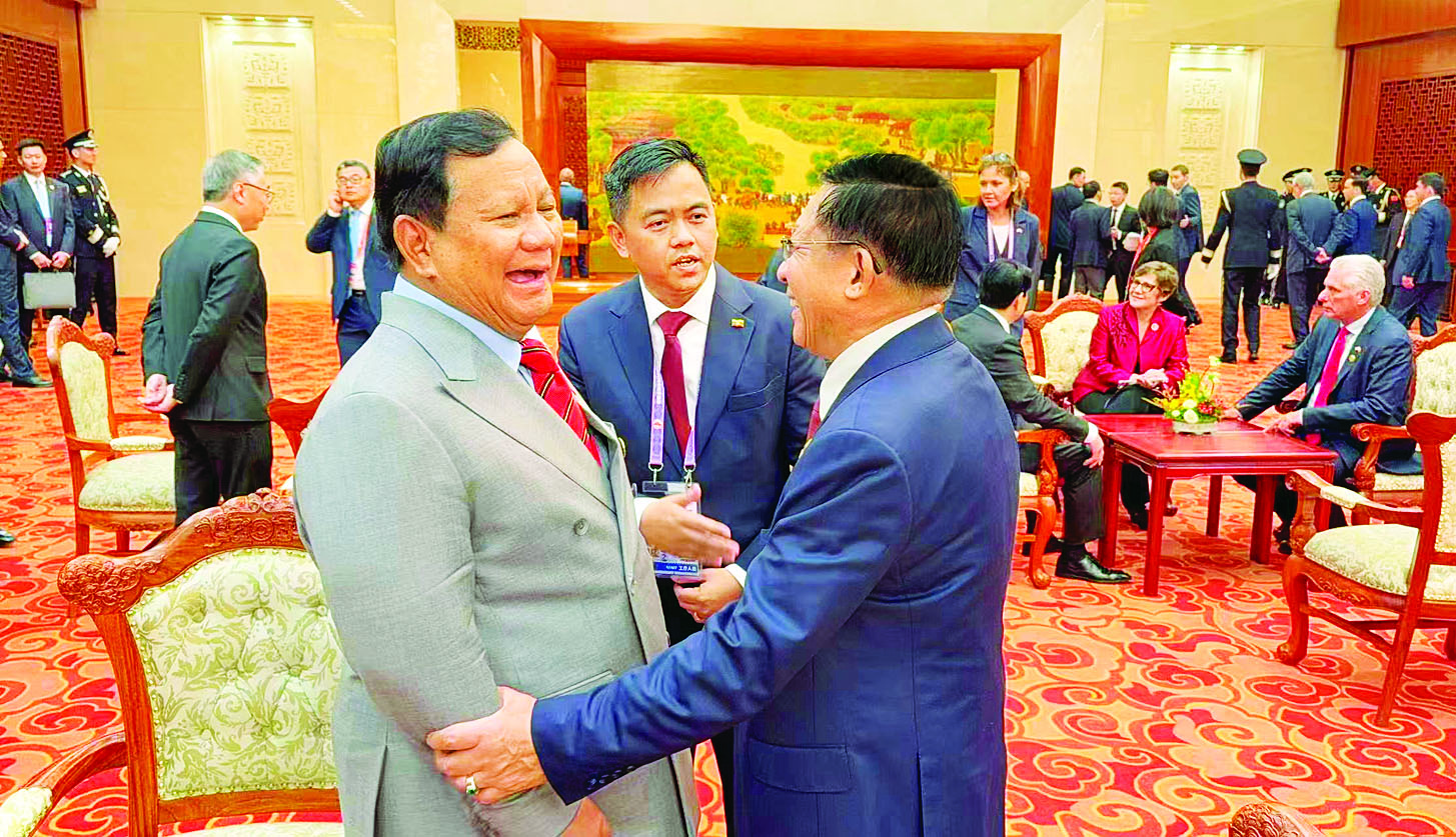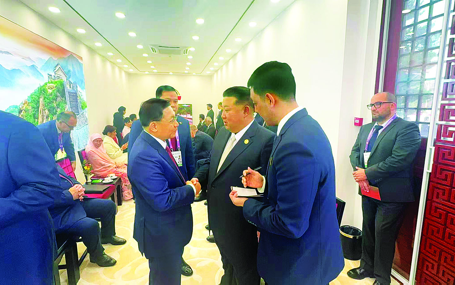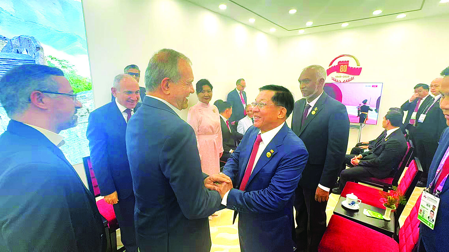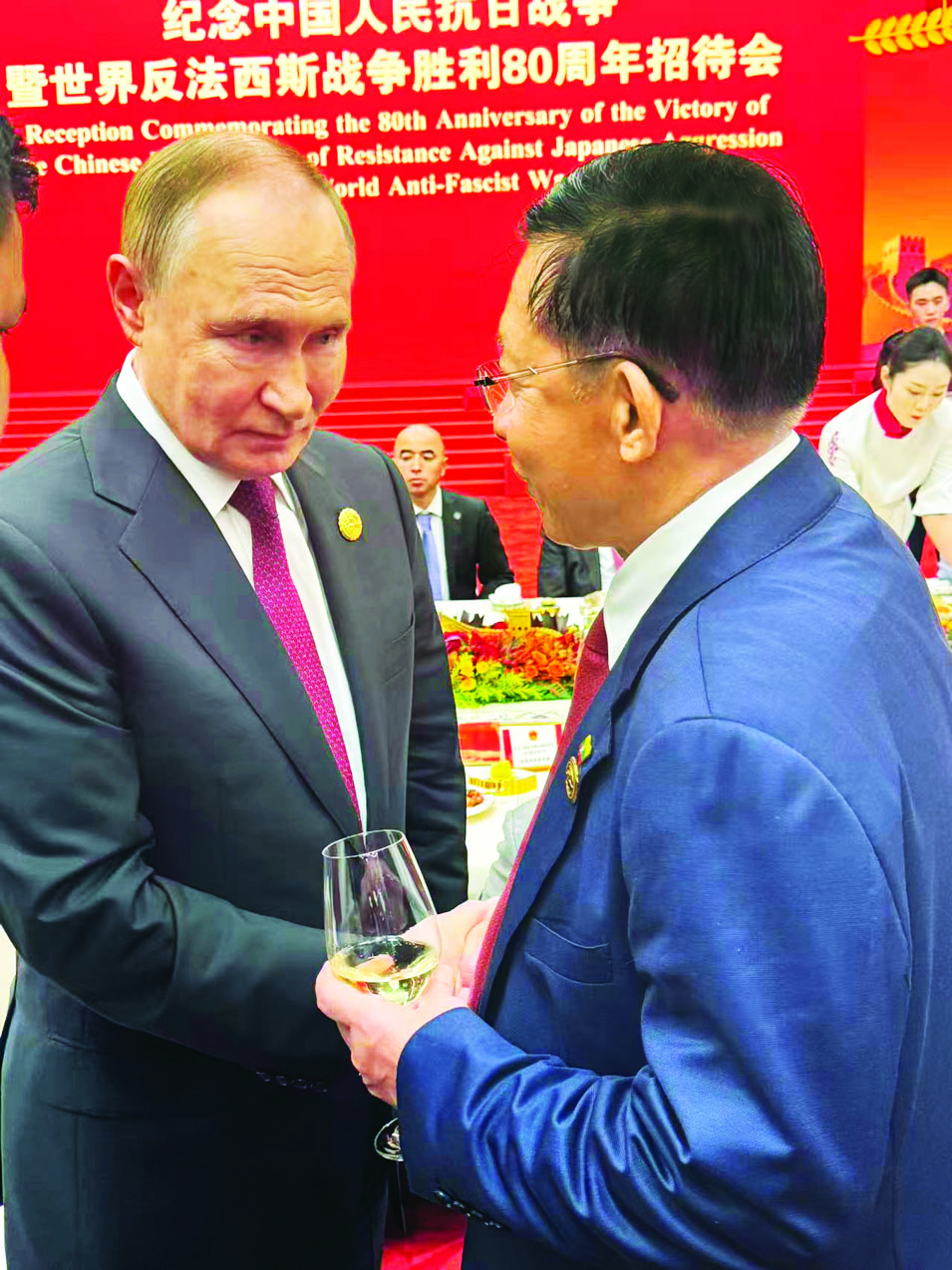 ပြည်ထောင်စုသမ္မတမြန်မာနိုင်ငံတော်ယာယီသမ္မတ နိုင်ငံတော်လုံခြုံရေးနှင့် အေးချမ်းသာယာရေးကော်မရှင်ဥက္ကဋ္ဌ ဗိုလ်ချုပ်မှူးကြီး မင်းအောင်လှိုင်သည် စစ်ရေးပြအခမ်းအနားမစတင်မီအချိန်တွင် တရုတ်ပြည်သူများ၏ ဂျပန်ခုခံတော်လှန်ရေးစစ်ပွဲနှင့် ကမ္ဘာ့ဖက်ဆစ်ဆန့်ကျင်ရေးစစ်ပွဲအောင်နိုင်ခြင်း နှစ် (၈၀) ပြည့် အထိမ်းအမှတ်စစ်ရေးပြအခမ်းအနားသို့ ပါဝင်တက်ရောက်လာကြသည့် နိုင်ငံတကာမှ နိုင်ငံ့ခေါင်းဆောင်များနှင့် တစ်ဦးချင်းရင်းရင်းနှီးနှီးတွေ့ဆုံ၍ နိုင်ငံအလိုက် ပူးပေါင်းဆောင်ရွက်နိုင်ရေးကိစ္စရပ်များအား ရင်းရင်းနှီးနှီးဆွေးနွေးခဲ့ကြောင်း သတင်းရရှိသည်။