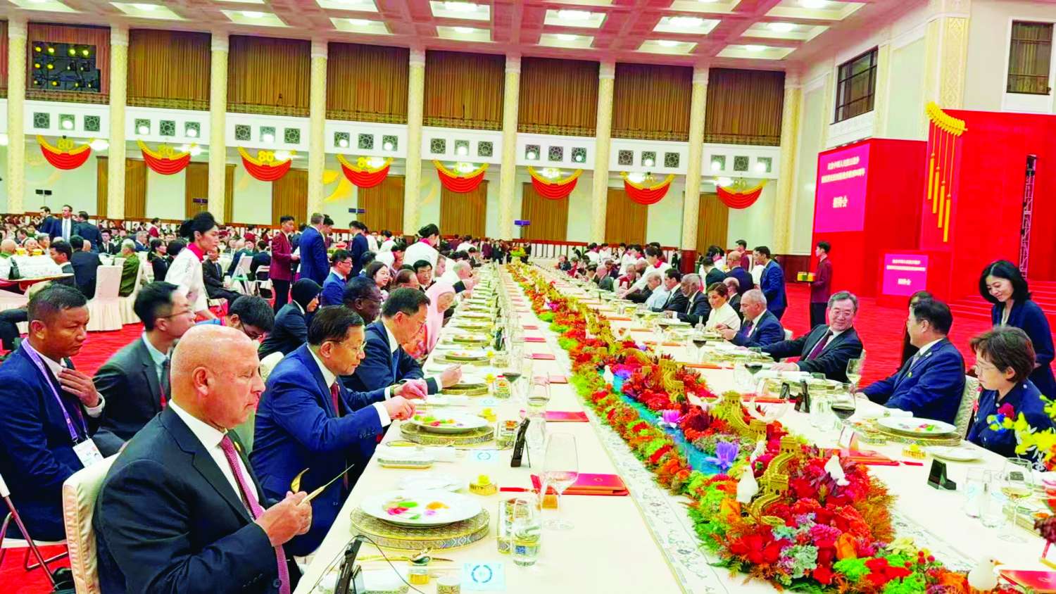ပြည်ထောင်စုသမ္မတမြန်မာနိုင်ငံတော်ယာယီသမ္မတ နိုင်ငံတော်လုံခြုံရေးနှင့် အေးချမ်းသာယာရေးကော်မရှင်ဥက္ကဋ္ဌ ဗိုလ်ချုပ်မှူးကြီး မင်းအောင်လှိုင်၊ နိုင်ငံတကာမှ ဖိတ်ကြားထားသည့် နိုင်ငံ့အကြီးအကဲများသည် တရုတ်ပြည်သူ့သမ္မတနိုင်ငံ သမ္မတ H.E. Mr. Xi Jinping က တည်ခင်းဧည့်ခံသည့် ဂုဏ်ပြုနေ့လယ်စာစားပွဲသို့ တက်ရောက်ကြသည်။