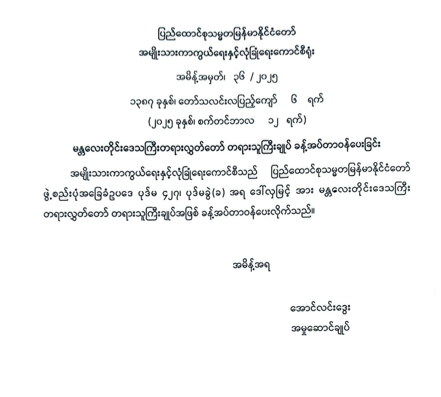 မန္တလေးတိုင်းဒေသကြီးတရားလွှတ်တော် တရားသူကြီးချုပ် ခန့်အပ်တာဝန်ပေးခြင်း