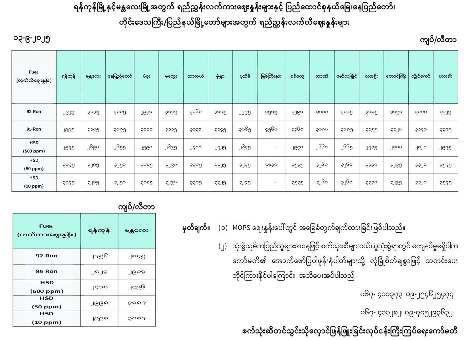 ရန်ကုန်မြို့နှင့် မန္တလေးမြို့အတွက် ရည်ညွှန်းလက်ကားဈေးနှုန်းများနှင့် ပြည်ထောင်စုနယ်မြေ နေပြည်တော်၊ တိုင်းဒေသကြီး/ပြည်နယ် မြို့တော်များအတွက် ရည်ညွှန်းလက်လီဈေးနှုန်းများ 09/13/2025