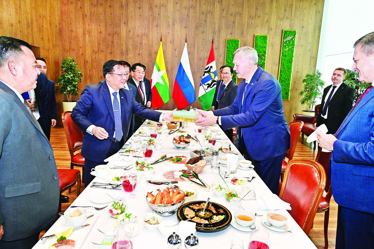 ထိုသို့တွေ့ဆုံဆွေးနွေးစဉ် မြန်မာနိုင်ငံမှ အသင့်ပြင်ဆင်လာသည့် မြန်မာ့ရိုးရာအစားအစာဖြစ်သည့် လက်ဖက်အုပ်၊ လက်ဖက်ရည်၊ အသင့်ချက်ပြုတ်လာသည့် ငါးသလောက်ပေါင်းတို့ဖြင့် တည်ခင်းဧည့်ခံခဲ့ရာ နိုဗာစီဗစ်ဒေသအုပ်ချုပ်ရေးမှူးနှင့် အဖွဲ့ဝင်များက မြိန်ရှက်စွာသုံးဆောင်ခဲ့ကြပြီး ပြည်ထောင်စုသမ္မတ မြန်မာနိုင်ငံတော်ယာယီသမ္မတ နိုင်ငံတော်လုံခြုံရေးနှင့် အေးချမ်းသာယာရေးကော်မရှင်ဥက္ကဋ္ဌက မြန်မာ့ရိုးရာစားသောက်ဖွယ်ရာများနှင့် ပတ်သက်၍ ရှင်းလင်းပြောကြားခဲ့သည်။