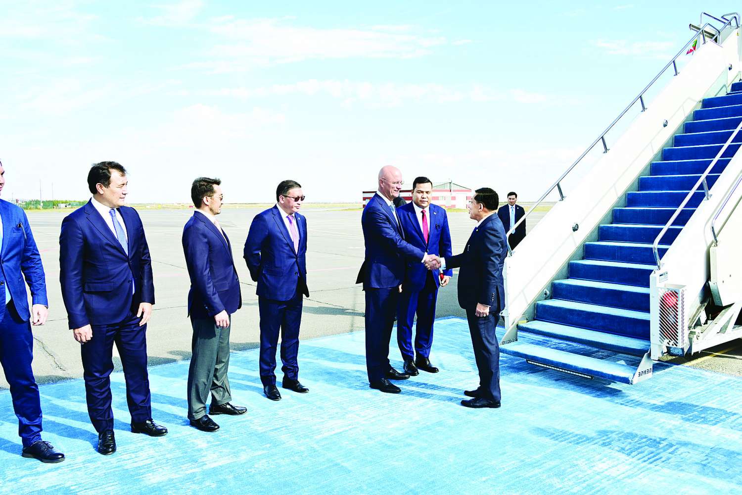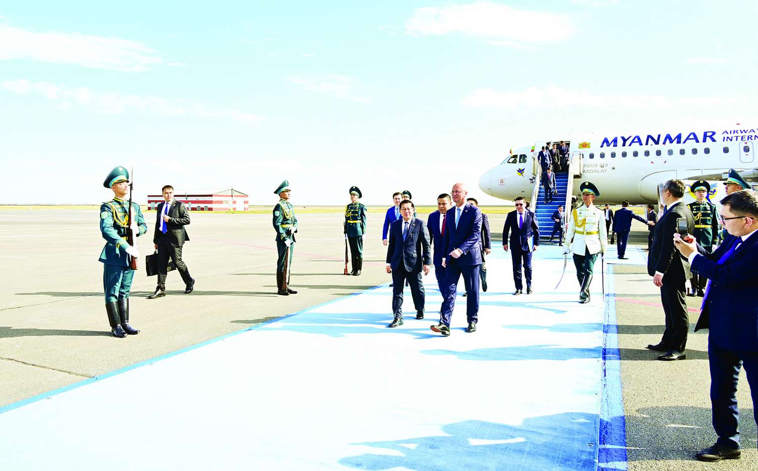 ပြည်ထောင်စုသမ္မတမြန်မာနိုင်ငံတော် ယာယီသမ္မတ နိုင်ငံတော်လုံခြုံရေးနှင့် အေးချမ်းသာယာရေးကော်မရှင်ဥက္ကဋ္ဌ ဗိုလ်ချုပ်မှူးကြီး မင်းအောင်လှိုင် ကာဇက်စတန်သမ္မတနိုင်ငံသို့ ရောက်ရှိ