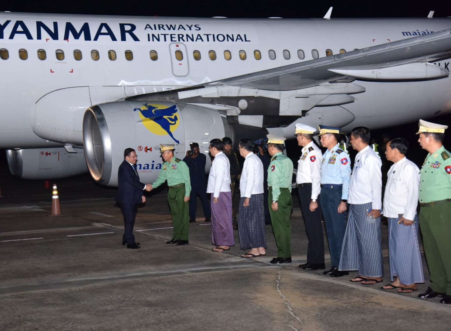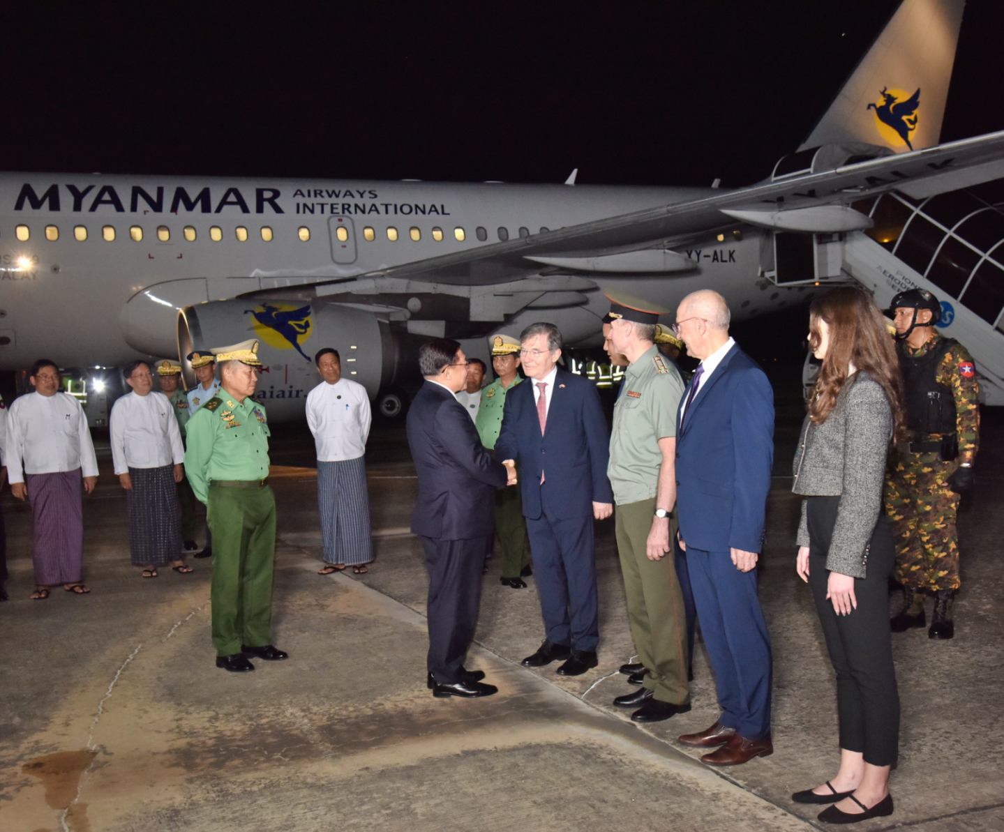 ထို့နောက် နိုင်ငံတော်ယာယီသမ္မတ နိုင်ငံတော်လုံခြုံရေးနှင့် အေးချမ်းသာယာရေးကော်မရှင်ဥက္ကဋ္ဌ ဦးဆောင်သည့် မြန်မာအဆင့်မြင့်ကိုယ်စားလှယ်အဖွဲ့သည် ညနေပိုင်းတွင် နေပြည်တော်တပ်မတော်လေဆိပ်သို့ ပြန်လည်ရောက်ရှိကြရာ ကော်မရှင်ဒုတိယဥက္ကဋ္ဌ ဒုတိယဗိုလ်ချုပ်မှူးကြီး စိုးဝင်း၊ ကော်မရှင်အဖွဲ့ဝင် နိုင်ငံတော်ဝန်ကြီးချုပ် ဦးညိုစော၊ ကော်မရှင်အဖွဲ့ဝင် အမှုဆောင်ချုပ် ဦးအောင်လင်းဒွေး၊ ကော်မရှင်အဖွဲ့ဝင်များ၊ ပြည်ထောင်စုဝန်ကြီးများ၊ မြန်မာနိုင်ငံဆိုင်ရာ ရုရှားဖက်ဒရေးရှင်းနိုင်ငံ သံအမတ်ကြီး H.E. Mr. Iskander Azizov ၊ ကာကွယ်ရေးဦးစီးချုပ်ရုံးမှ အဆင့်မြင့်တပ်မတော်အရာရှိကြီးများ၊ နေပြည်တော်တိုင်းစစ်ဌာနချုပ် တိုင်းမှူး၊ မြန်မာနိုင်ငံဆိုင်ရာ ရုရှားဖက်ဒရေးရှင်းနိုင်ငံသံရုံး၊ စစ်သံရုံးတို့မှ တာဝန်ရှိသူများက ကြိုဆိုနှုတ်ဆက်ခဲ့ကြကြောင်း သတင်းရရှိသည်။