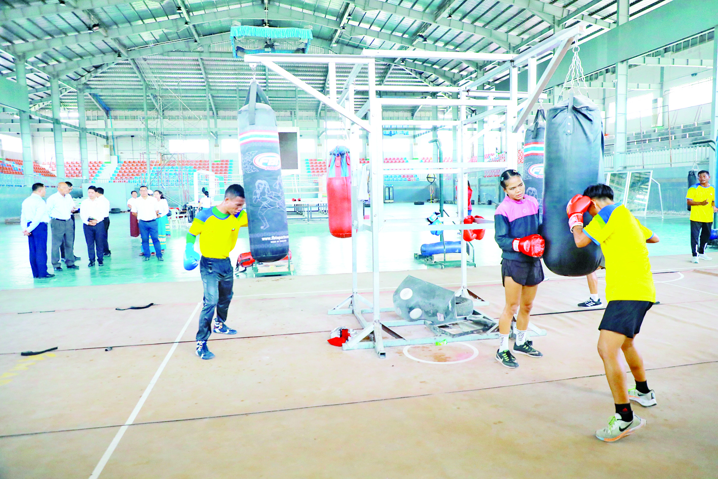မြန်မာနိုင်ငံ အိုလံပစ်ကော်မတီဥက္ကဋ္ဌ အားကစားနှင့်လူငယ်ရေးရာဝန်ကြီးဌာနနှင့် ဟိုတယ်နှင့်ခရီးသွားလာရေးဝန်ကြီးဌာန ပြည်ထောင်စုဝန်ကြီး Jeng Phang နော်တောင်သည် အားကစားနှင့်လူငယ်ရေးရာဝန်ကြီးဌာန ဒုတိယဝန်ကြီး ဦးဇင်မင်းထက်၊ တာဝန်ရှိသူများနှင့်အတူ ယနေ့ နံနက်ပိုင်းတွင် (၃၃)ကြိမ်မြောက် အရှေ့တောင်အာရှအားကစားပြိုင်ပွဲသို့ ဝင်ရောက်ယှဉ်ပြိုင်ရန် လက်ဝှေ့နှင့်ပိုက်ကျော်ခြင်းအားကစားအဖွဲ့များ စခန်းဝင်လေ့ကျင့်နေမှုကို ကြည့်ရှုအားပေးသည်။