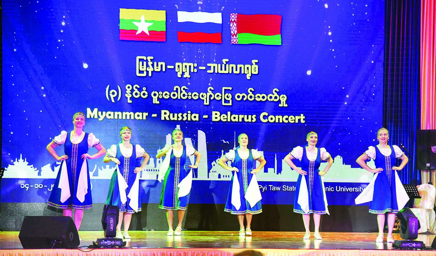 ယင်းနောက် ဖျော်ဖြေရေးအစီအစဉ်အားစတင်ကျင်းပရာ ဘယ်လာရုစ်နိုင်ငံမှ အနုပညာရှင်များ၊ သာသနာရေးနှင့်ယဉ်ကျေးမှုဝန်ကြီးဌာန၊ အနုပညာဦးစီးဌာနမှ အနုပညာရှင်ဝန်ထမ်းများ၊ ပြန်ကြားရေးဝန်ကြီးဌာန၊ မြန်မာ့အသံနှင့်ရုပ်မြင်သံကြားမှ အနုပညာရှင်ဝန်ထမ်းများ၊ ကာကွယ်ရေးဦးစီးချုပ်ရုံး(ကြည်း)၊ ပြည်သူ့ဆက်ဆံရေးနှင့် စိတ်ဓာတ်စစ်ဆင်ရေး ညွှန်ကြားရေးမှူးရုံးကွပ်ကဲမှုအောက်မြဝတီတေးဂီတအဖွဲ့မှ အနုပညာရှင်ဝန်ထမ်းများနှင့် မြန်မာနိုင်ငံဆိုင်ရာရုရှားဖက်ဒရေးနိုင်ငံသံရုံးမှ ဝန်ထမ်းများက“ရုရှားနှင့် ဘယ်လာရုစ်-သွေးရင်း အကိုညီရင်းနှမ (Two Rus’s- Belarus and Russia, Two Sisters)”တေးသီချင်း၊ “ခေါင်းလောင်းသံ (Bells)” တေးသီချင်း၊ “နန်းသိင်္ဂီ”နန်းတွင်းယိမ်းအက၊ “The River Flows” တေးသီချင်း၊ “ဘော်ဒကာ တစ်ခွက်နဲ့ နှုတ်ဆက်မယ်” တေးသီချင်း၊ “ပန်းပုသူဇာ” တေးသီချင်း၊ “မျက်ဝန်း(My eyes)” တေးသီချင်း၊ “လယ်ဘယ်ဒူးရှ်ကာ (Lebedushka)” အက၊ “မနောကြည်ချိုမြ ဗျောစည်တိုအက” ၊ “ကျူးလစ်ပန်း(Tulips)” တေးသီချင်း၊ “ဒို့ရွာနီ (Red Sloboda)” တေးသီချင်း၊ “မြိုင်ဆိုင်မြူးကြွမင်းသားအက”၊ “ဩော်တံစဉ်ကျွန်တော်တံစဉ် (Oh, My Scythe)” တေးသီချင်း၊ “ကာလင်ကာ(Kalinka)” အက၊ “ Belarus and Myanmar” တေးသီချင်း၊ “မြန်မာ”တေးသီချင်း၊ “သင်္ကြန်”တေးသီချင်း၊ “Kupalinka” တေးသီချင်း၊ “ရီဗာရောနော့ခ်(Zhavoronok)” တေးသီချင်း၊ “ပုဂံ” တေးသီချင်း၊ “အတူရှိမယ် မြန်မာ(We are With You Myanmar)” တေးသီချင်း၊ “မြန်မာဟေ့” တေးသီချင်း၊ “ကာကျူးရှာ(Katush)” တေးသီချင်း၊ “အမိမြေ(Matushka Zemnya Mother Land)” တေးသီချင်း၊ “Love Me” တေးသီချင်း၊ “ပန်းရောင်စုံ (All the Flowers)” တေးသီချင်းနှင့် “တောင်းဆုခြွေ( I want to wish)”တေးသီချင်းတို့ဖြင့် သီဆိုတီးမှုတ် ကပြဖျော်ဖြေတင်ဆက်ကြသည်။