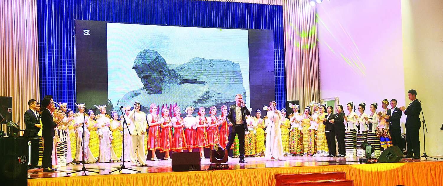မြန်မာ-ရုရှား-ဘယ်လာရုစ် (၃) နိုင်ငံပူးပေါင်းဖျော်ဖြေတင်ဆက်မှုအခမ်းအနားအား ယနေ့ညနေပိုင်းတွင် နေပြည်တော်ရှိ Naypyitaw State Polytechnic University ၌ကျင်းပရာ ပြည်ထောင်စုသမ္မတမြန်မာနိုင်ငံတော်ယာယီသမ္မတ နိုင်ငံတော်လုံခြုံရေးနှင့် အေးချမ်းသာယာရေးကော်မရှင်ဥက္ကဋ္ဌ ဗိုလ်ချုပ်မှူးကြီးမင်းအောင်လှိုင် တက်ရောက်ချီးမြှင့်သည်။