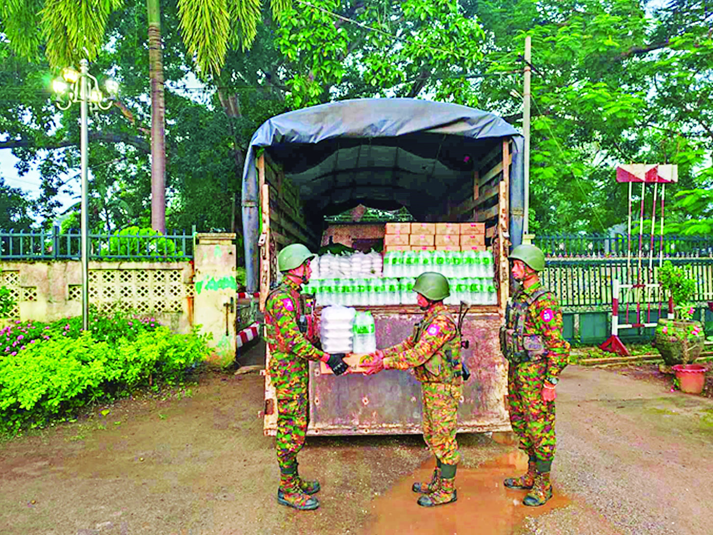 ယင်းသို့ စုပေါင်းသန့်ရှင်းရေးလုပ်ငန်းများ ဆောင်ရွက်လျက်ရှိသော တပ်မတော်သားများ၊ မြန်မာနိုင်ငံရဲတပ်ဖွဲ့ဝင်များ၊ မီးသတ်တပ်ဖွဲ့ဝင်များ၊ ဌာနဆိုင်ရာဝန်ထမ်းများနှင့် ဒေသခံပြည်သူများအတွက် အလှူရှင်များကလှူဒါန်းသော ဒံပေါက်၊ ရေသန့်ဘူးများနှင့် အချိုရည်များကို တာဝန်ရှိသူများက လက်ဝယ်အရောက်ပေးအပ်လှူဒါန်းပေးကြသည်။