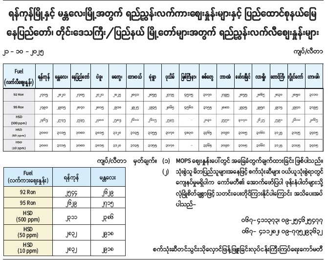 ရန်ကုန်မြို့နှင့် မန္တလေးမြို့အတွက် ရည်ညွှန်းလက်ကားဈေးနှုန်းများနှင့် ပြည်ထောင်စုနယ်မြေ နေပြည်တော်၊ တိုင်းဒေသကြီး/ပြည်နယ် မြို့တော်များအတွက် ရည်ညွှန်းလက်လီစျေးနှုန်းများ