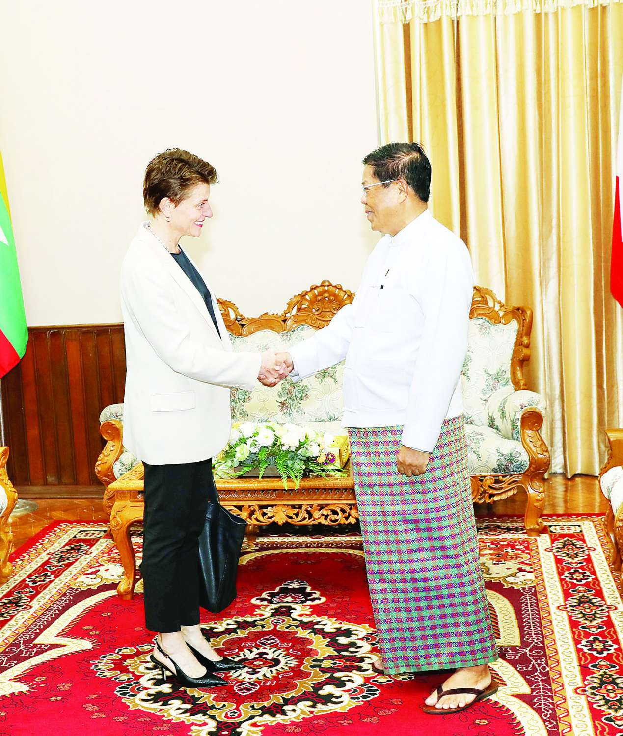 နိုင်ငံခြားရေးဝန်ကြီးဌာန ပြည်ထောင်စုဝန်ကြီးဦးသန်းဆွေသည် မြန်မာနိုင်ငံဆိုင်ရာ ကုလသမဂ္ဂယာယီဌာနေ ညှိနှိုင်းရေးမှူးနှင့် လူသားချင်းစာနာထောက်ထားမှုဆိုင်ရာ ယာယီညှိနှိုင်းရေးမှူးဖြစ်သူ Ms.Gwyn Lewis အား ယနေ့နံနက် ၁၀ နာရီတွင် နေပြည်တော်ရှိ နိုင်ငံခြားရေးဝန်ကြီးဌာန၌ လက်ခံတွေ့ဆုံသည်။