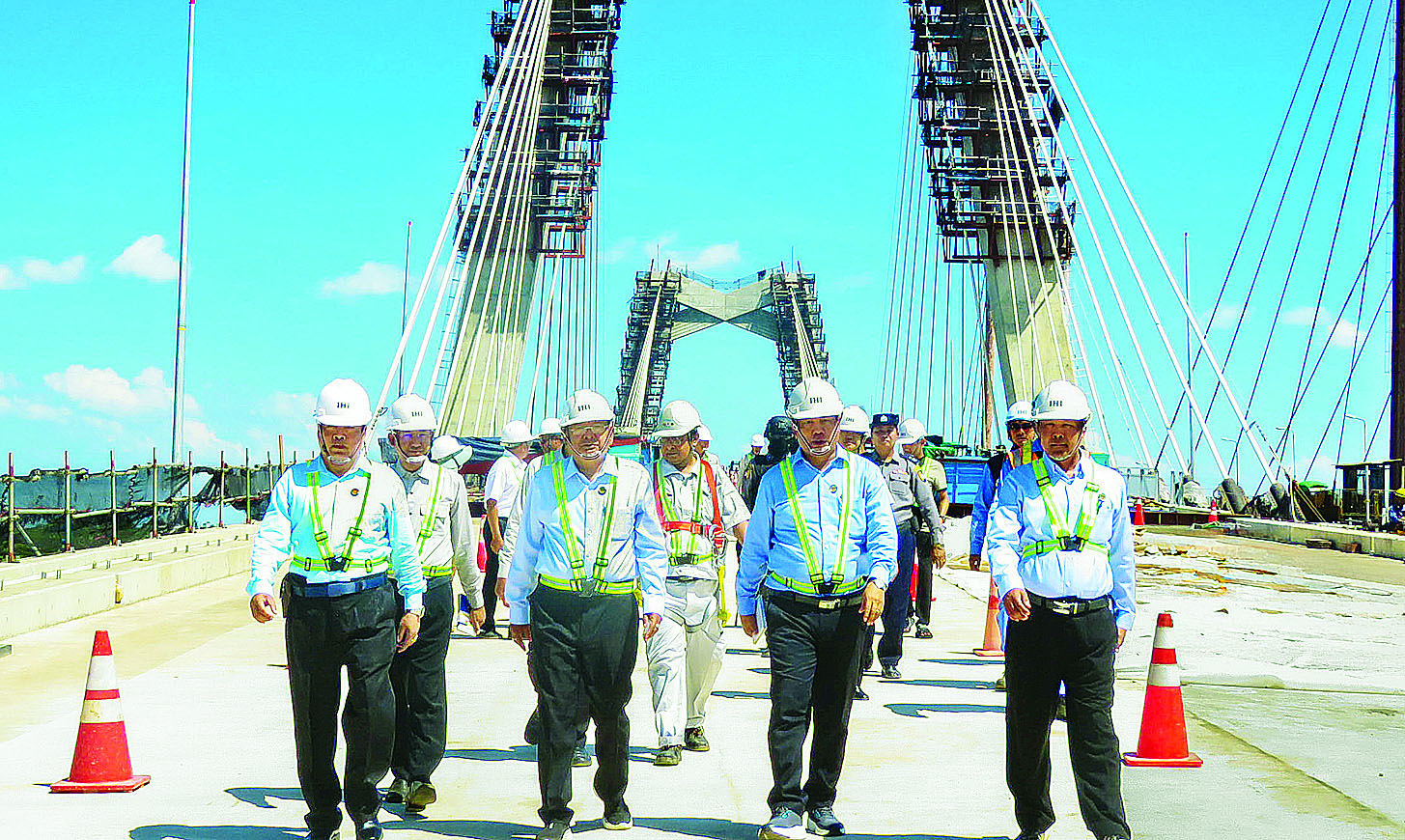 တင်ပြချက်များနှင့်စပ်လျဉ်း၍ ဒုတိယဝန်ကြီးက လုပ်ငန်းစီမံချက်အတိုင်း တံတားလုပ်ငန်းနှင့် ဆက်စပ်လုပ်ငန်းများ တစ်ပြိုင်တည်းပြီးစီးအောင် ဆောင်ရွက်သွားရန်၊ တည်ဆောက်ရေးလုပ်ငန်းများ ဆောင်ရွက်နေစဉ် သဘာဝပတ်ဝန်းကျင်ထိခိုက်မှု မရှိစေရေး အထူးဂရုပြုဆောင်ရွက်ရန်တို့ကိုမှာကြားပြီး သံမဏိကြိုးတပ်ဆင် ဆောင်ရွက်ထားရှိမှုနှင့် ဆက်စပ်လုပ်ငန်းများ ဆောင်ရွက်နေမှုတို့ကို အသေးစိတ် ကြည့်ရှုစစ်ဆေးသည်။