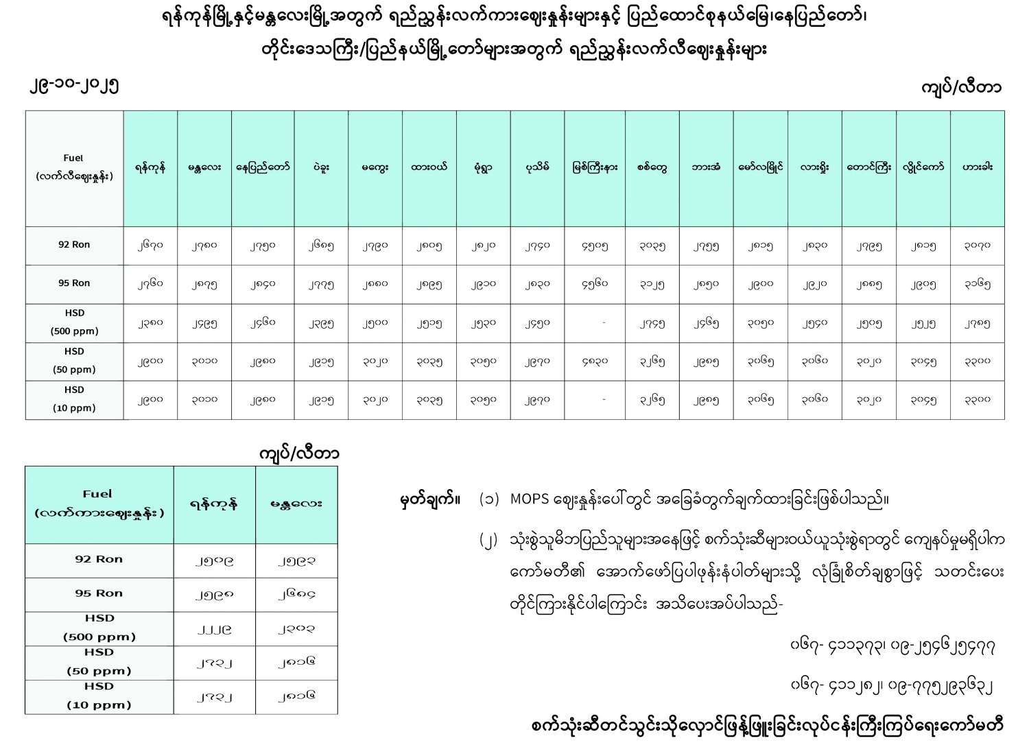 ရန်ကုန်မြို့နှင့် မန္တလေးမြို့အတွက် ရည်ညွှန်းလက်ကားဈေးနှုန်းများနှင့် ပြည်ထောင်စုနယ်မြေ နေပြည်တော်၊ တိုင်းဒေသကြီး/ပြည်နယ် မြို့တော်များအတွက် ရည်ညွှန်းလက်လီဈေးနှုန်းများ 10/29/2025