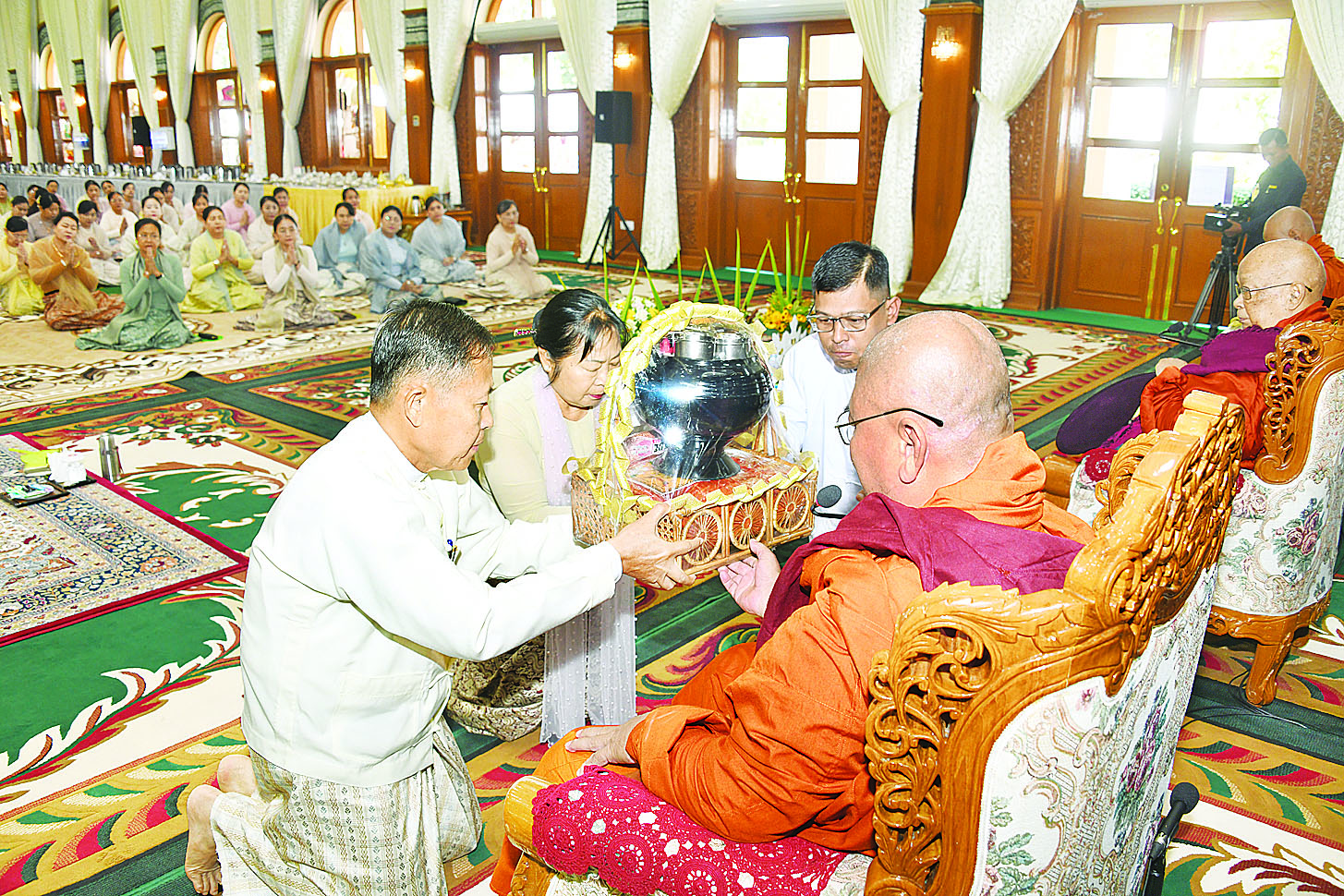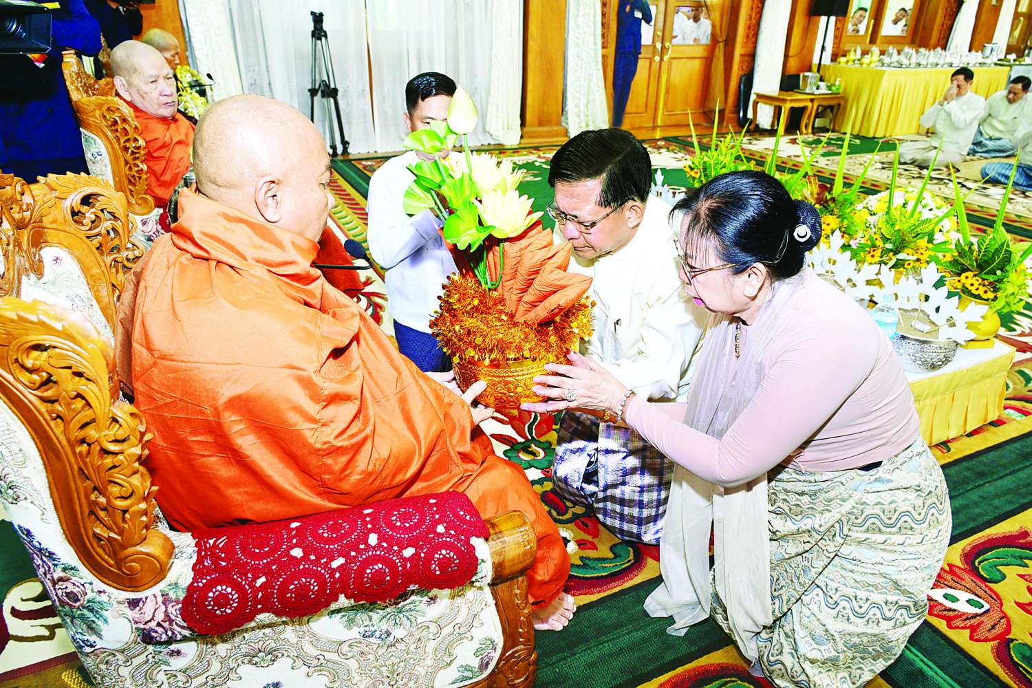 ဦးစွာ နိုင်ငံတော်လုံခြုံရေးနှင့်အေးချမ်းသာယာရေးကော်မရှင်ဥက္ကဋ္ဌ တပ်မတော်ကာကွယ်ရေးဦးစီးချုပ်နှင့်ဇနီး၊ ဧည့်ပရိသတ်များသည် ဘုန်းတော်ကြီးကျောင်းအသီးသီးသို့ လှူဒါန်းရန် ခင်းကျင်းပြင်ဆင်ထားသည့် ကထိန်လျာသင်္ကန်း၊ လှူဖွယ်ပစ္စည်းများနှင့် ပဒေသာပင်များအား လှည့်လည်ကြည့်ရှုကြသည်။ ထို့နောက် နိုင်ငံတော်လုံခြုံရေးနှင့် အေးချမ်းသာယာရေးကော်မရှင်ဥက္ကဋ္ဌ တပ်မတော်ကာကွယ်ရေးဦးစီးချုပ်သည် အနော်ရထာခန်းမအတွင်းရှိ ဗုဒ္ဓရုပ်ပွားတော်မြတ်အား ဖူးမြော်ကြည်ညို၍ မြသပိတ်ဆွမ်းတော်နှင့် ပန်း၊ သောက်တော်ရေချမ်း၊ ဆီမီး၊ သစ်သီးတို့ကို ဆက်ကပ်လှူဒါန်းသည်။