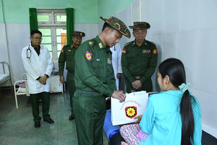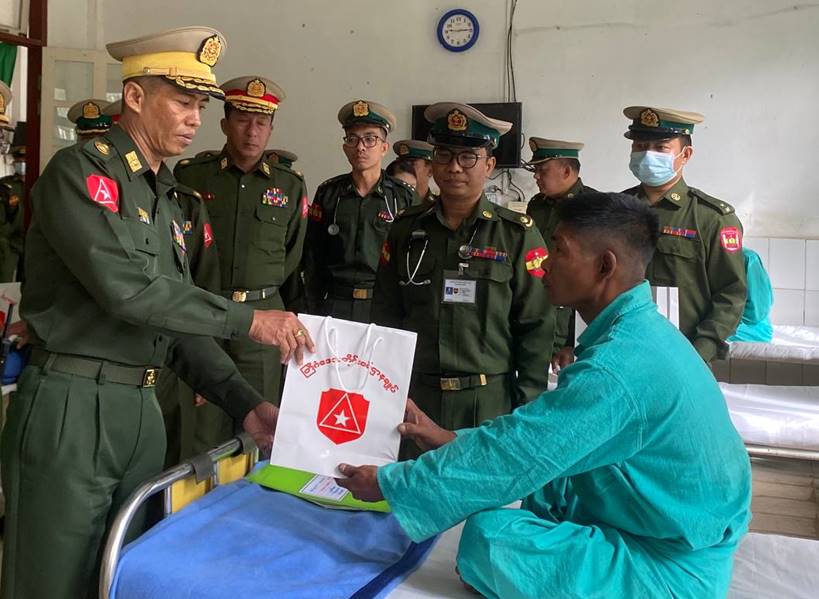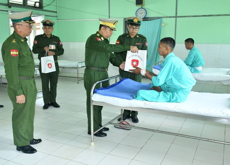 ရှမ်းပြည်နယ်(တောင်ပိုင်း) အောင်ပန်းမြို့နှင့်ခိုလမ်မြို့တို့ရှိ တပ်မတော်ဆေးရုံများ၊ ရှမ်းပြည်နယ်(အရှေ့ပိုင်း) ကျိုင်းတုံမြို့ရှိတပ်မတော်ဆေးရုံ၊ တနင်္သာရီတိုင်းဒေသကြီး မြိတ်မြို့ရှိ တပ်မတော်ဆေးရုံ၊ ရန်ကုန်တိုင်းဒေသကြီး မင်္ဂလာဒုံမြို့နယ်ရှိ တပ်မတော်အရိုးရောဂါ အထူးကုဆေးရုံကြီး(ခုတင်-၅၀၀)နှင့် တပ်မတော်ဆေးရုံကြီး(ခုတင်-၁၀၀၀)၊ မန္တလေးတိုင်းဒေသကြီး၊ မန္တလေးမြို့ နန်းမြို့တွင်းရှိ တပ်မတော်ဆေးရုံနှင့် ပဲခူးတိုင်းဒေသကြီး တောင်ငူမြို့ရှိ တပ်မတော်ဆေးရုံတို့၌ တက်ရောက်ဆေးကုသမှုခံယူလျက်ရှိသော အရာရှိ၊ စစ်သည်၊ မိသားစုဝင်များ၊ ပြည်သူ့စစ်မှုထမ်းများ၊ စစ်မှုထမ်းဟောင်းအဖွဲ့ဝင်များ၊ မြန်မာနိုင်ငံရဲတပ်ဖွဲ့ဝင်များ၊ ပြည်သူ့စစ်(ဌာနေ)တပ်ဖွဲ့ဝင်များနှင့် ဒေသခံပြည်သူများအား ယနေ့တွင် သက်ဆိုင်ရာ တိုင်းစစ်ဌာနချုပ်များမှ တိုင်းမှူးများနှင့်တာဝန်ရှိသူများက သွားရောက်ကြည့်ရှု၍ တစ်ဦးချင်း၏ ရောဂါဖြစ်ပွားမှု၊ ဆေးဝါးကုသပေးထားမှုနှင့် ကျန်းမာရေးတိုးတက်ကောင်းမွန်မှုအခြေအနေများကို မေးမြန်းအားပေးစကားပြောကြားပြီး အာဟာရဖြည့်စားသောက်ဖွယ်ရာများနှင့် ချီးမြှင့်ငွေများပေးအပ်ကြသည်။