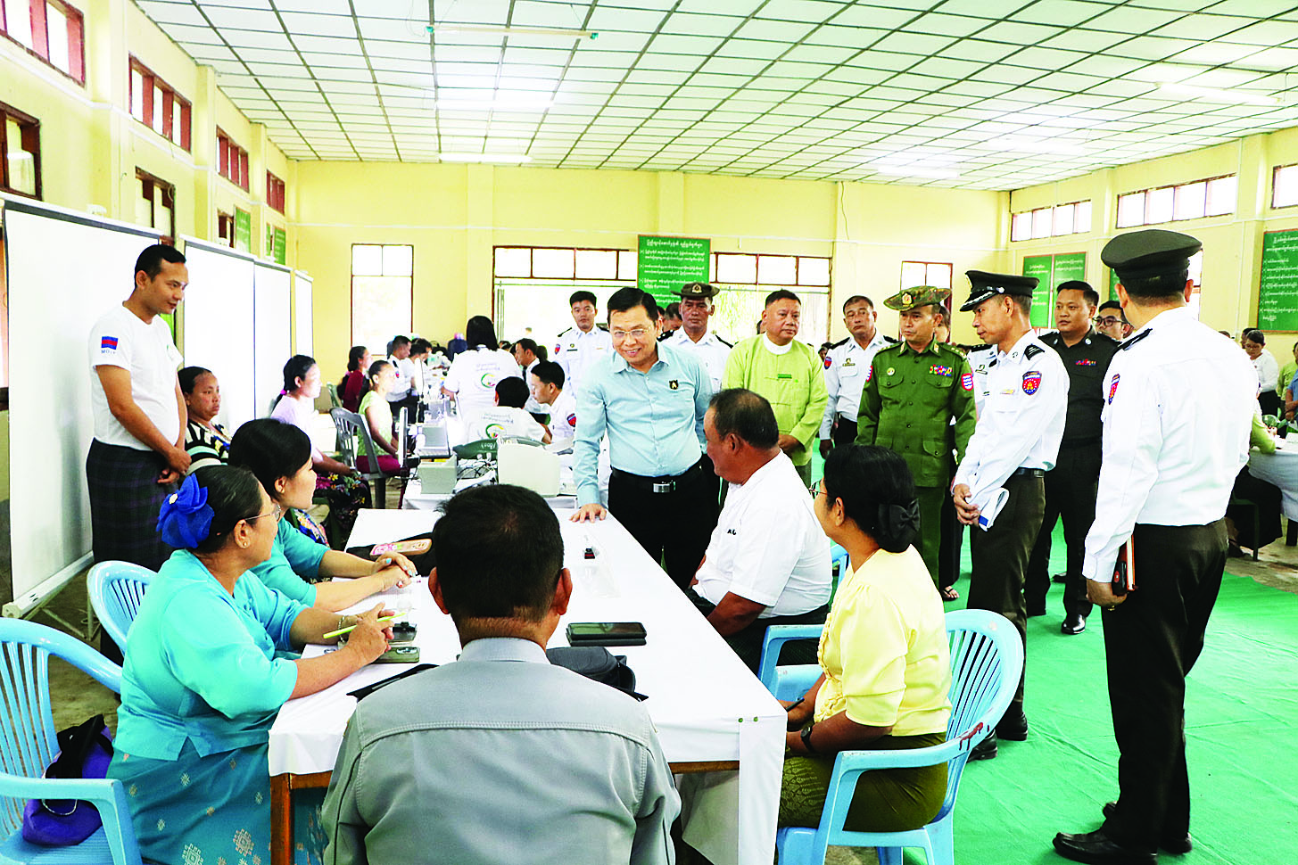 ဦးစွာ ပြည်ထောင်စုဝန်ကြီး သည် အိမ်ထောင်စုလူဦးရေစာရင်းနှင့် နိုင်ငံသားစိစစ်ရေးကတ်ပြားရရှိရေး လာရောက်ဆောင်ရွက်ကြသည့် ဒေသခံပြည်သူများအား လုပ်ငန်းဆိုင်ရာ အခက်အခဲများကို မေးမြန်းဆွေးနွေးပြီး ဝန်ထမ်းများက ပန်းခင်းစီမံချက်အဆင့်(၃)ဖြင့် အိမ်ထောင်စုလူဦးရေစာရင်းနှင့် နိုင်ငံသားစိစစ်ရေးကတ်ပြားထုတ်ပေးနိုင်ရေးအတွက် လုပ်ထုံးလုပ်နည်းနှင့်အညီ စိစစ်၍ One Stop Service ဖြင့် လုပ်ငန်းစဉ်အဆင့်ဆင့် ဆောင်ရွက်နေမှုနှင့် နိုင်ငံသားစိစစ်ရေးကတ်ပြား ရရှိပြီးသူများအား e-ID စနစ်ဖြင့် Biographic/Biometric ကောက်ယူကာ Unique ID နံပါတ်တစ်ပါ တည်းဆောင်ရွက်ထုတ်ပေးနေမှုများကို ကြည့်ရှုအားပေးသည်။