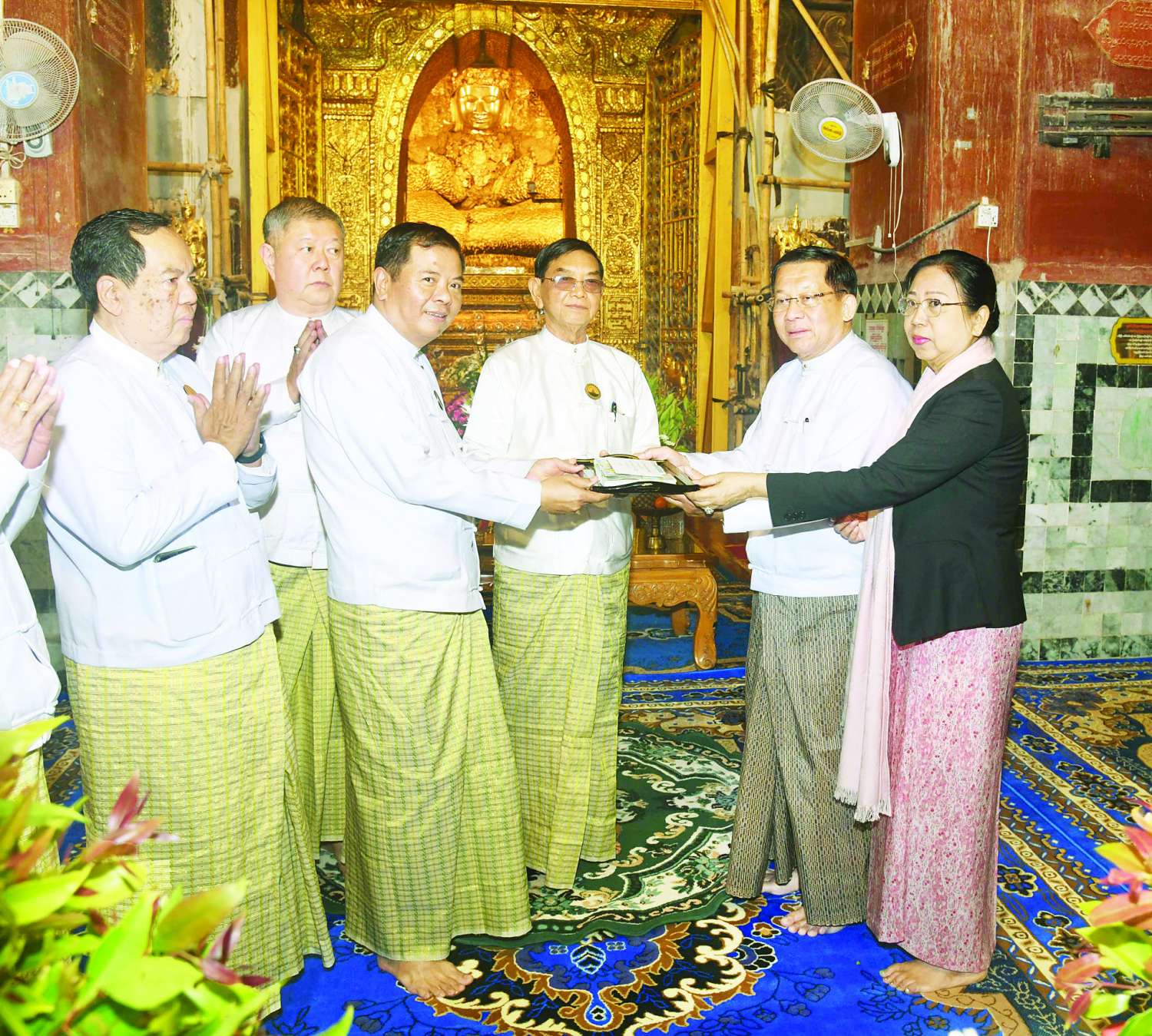ဆက်လက်၍ နိုင်ငံတော်ယာယီသမ္မတ နိုင်ငံတော်လုံခြုံရေးနှင့်အေးချမ်းသာယာရေးကော်မရှင်ဥက္ကဋ္ဌနှင့် ဇနီးတို့က ဘုရားကြီး ဘက်စုံပြုပြင်မွမ်းမံရန်အတွက် စုပေါင်းအလှူတော်ငွေများကို ပေးအပ်လှူဒါန်းရာ ဂေါပကအဖွဲ့မှ တာဝန်ရှိသူများက လက်ခံရယူကြသည်။